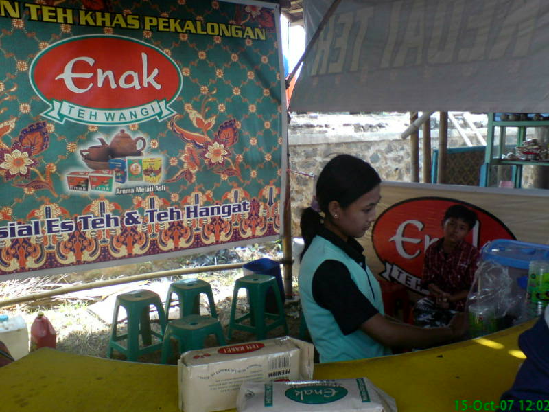 Snapshots of Indonesia >Teh Enak Pekalongan Posted by Ibenimages on 15 October 2007 > Menyempatkan mampir di sentra batik pekalongan. Penasaran melihat orang orang ngantri membeli Es Teh wangi ‘Enak’, so I also lined up for two. Share this: Share on X (Opens in new window) X Share on Facebook (Opens in new window) Facebook Share on Pinterest (Opens in new window) Pinterest Share on WhatsApp (Opens in new window) WhatsApp Share on LinkedIn (Opens in new window) LinkedIn Email a link to a friend (Opens in new window) Email Like Loading...