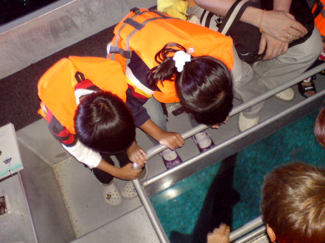 One feature at Siam Ocean World which Jakarta’s Sea World doesn’t have is Glass Bottom Boat. With this boat, visitors ride on the surface of the gigantic fish tank while observing the life underneath through its glass floor. As shown, Aya and Rafif had a close encounter with Tiger Shark from South Africa swimming past below the boat.