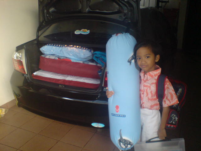Rafif and Aya will spend a night today at school. They will participate in “Malam Kebersamaan” which will involve a lot of activities. The car trunk is full with the kids’ properties, while Rafif doesn’t forget to bring his favourite “guling” (bolster). Have fun kids!