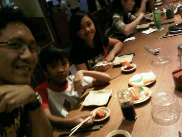 The mom is currently out of town, so I take just the kids for dinner in Sushi Tei, Senayan City. Rafif gives Sashimi a first try, and surprisingly he likes it! Well, he will join forces with Aya on begging for Sushi Tei next time we’re going to the mall!