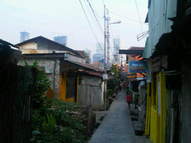 Knowing the jammed-packed Sudirman street, The Ojek did not take me to that route. Instead he took route through Jakarta’s skid rows, behind the tall skyscrappers.