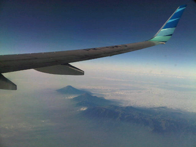 I had early flight today for business trip to Surabaya. One of the better things for taking the early flight is it will give you a clearer view of the scenery down below. Just like this morning, when our plane flew above Sindoro and Sumbing mountains in Central Java. I could also see Dieng plateau and its surrounding quite clearly. A beautiful sight to behold.