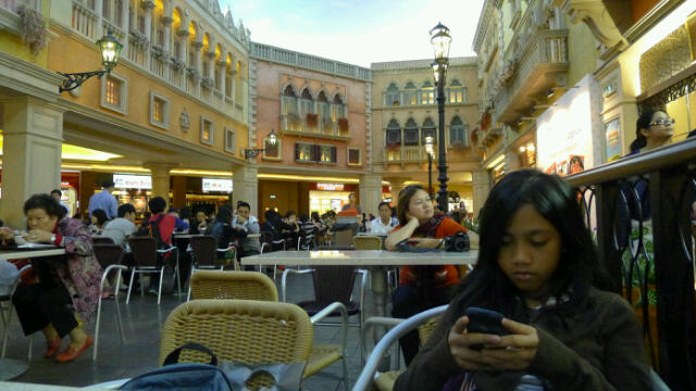Family, Snapshot of the World Venetian Food Court Posted by Ibenimages on 26 November 2011 Aya is busy chatting on her Blackberry, while waiting for her food in the Food Court, Venetian Casino Macau. Since we don’t do gambling, this place is nothing more than a giant mall for us 🙂 Share this: Share on X (Opens in new window) X Share on Facebook (Opens in new window) Facebook Share on Pinterest (Opens in new window) Pinterest Share on WhatsApp (Opens in new window) WhatsApp Share on LinkedIn (Opens in new window) LinkedIn Email a link to a friend (Opens in new window) Email Like Loading...
