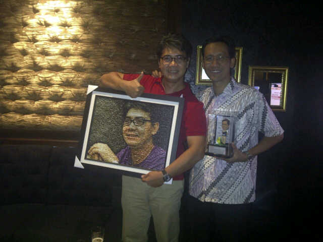 In a surprised setting, I received my farewell gift from my RBS colleagues in a Karaoke fun night. It was a mini figure of me as golfer with a brilliant words below. Nice. Here I was pictured with Yudhi, the other RBS colleague who also just left the bank. Thanks a lot friends! You’re the best!