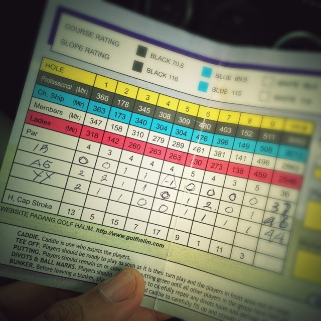 Playing in Padang Golf Halim 1 this morning with my usual golf buddies, I posted my best ever 9 holes score at the back nine: 37 (+1 over par), which include 1 birdie, 2 bogeys and 6 pars! With my first 9 score of 41, this sum up to 78 gross score.