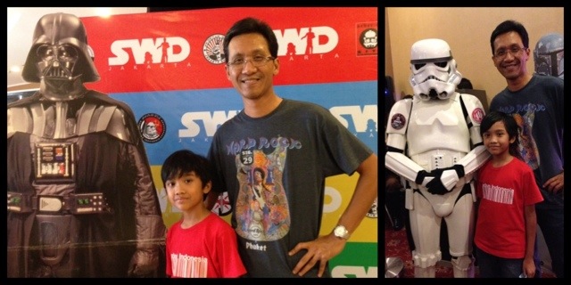 As Star Wars fans, I and Rafif won’t pass opportunity to come and see “Star Wars Day” – a fan-made event which exhibits many Star Wars memorabilia, art works, collector-item toys, and showcases vast range of interests from Star Wars fanatics, such as Light Saber skills, movies collection, cos-play and many more. If not only we come here with Elok and Aya, we could have easily dwelled ourselves in this exhibition. Many more posts to come from this event!