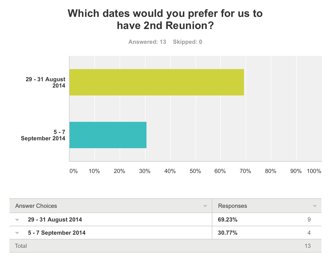 13 fellows entered their votes and decide when we should have second reunion. 9 out of 13 fellows voted to have this reunion on the weekend of 29-31 August 2014 instead of early September 2014 So there you go guys, book your tickets now!