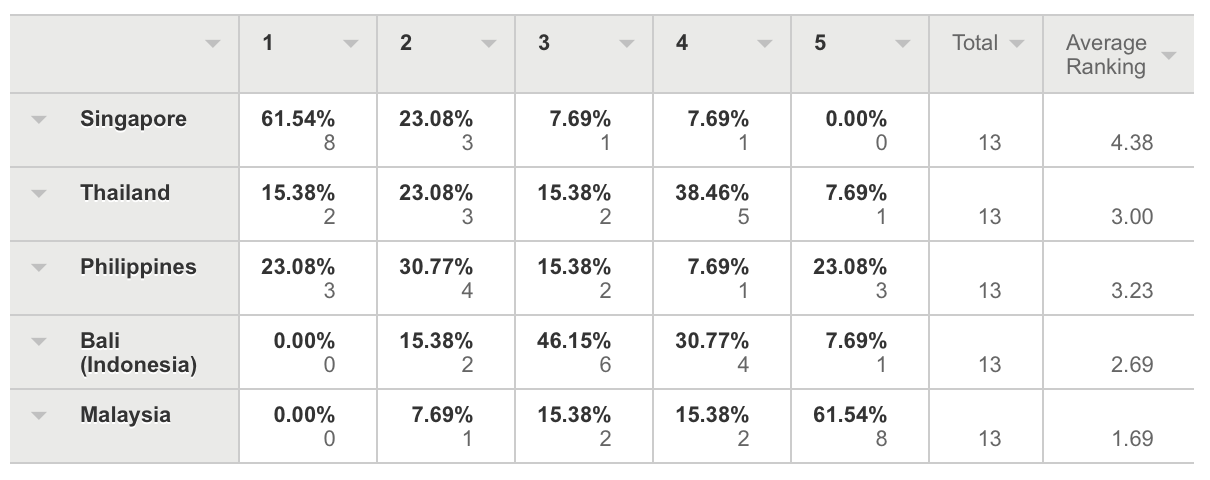 Facing with the second question which ask the fellow to rank the possible place/venue of second reunion, the fellows entered mixed responses. But in the end, SINGAPORE is a clear winner, followed by Phillipines in second place. The beautiful scene of beaches in Bali, Thailand are not enough to lure the fellows to strongly vote for these place. Maybe because it’s reunion, it’s the best thing to have in the city we were all first met!