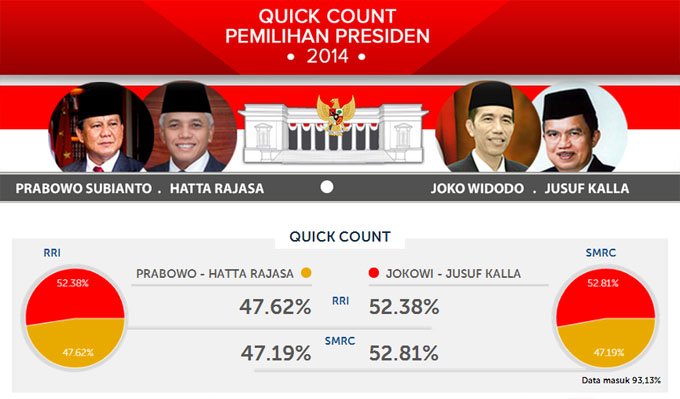 Selepas dhuhur, media massa, baik televisi ataupun social media, mulai gencar memberitakan hasil “quick count“. Yang sampai pada akhirnya kubu Jokowi-JK mendeklarasikan “kemenangan” mereka setelah mendapatkan hasil “quick count“, diantaranya dari LSI, Cyrus Network, RRI, dan Litbang Kompas yang menyatakan Jokowi-JK meraih suara 52-53%, lebih tinggi 6-7% dari kubu Prabowo-Hatta Rajasa yang berkisar antara 46-47%.