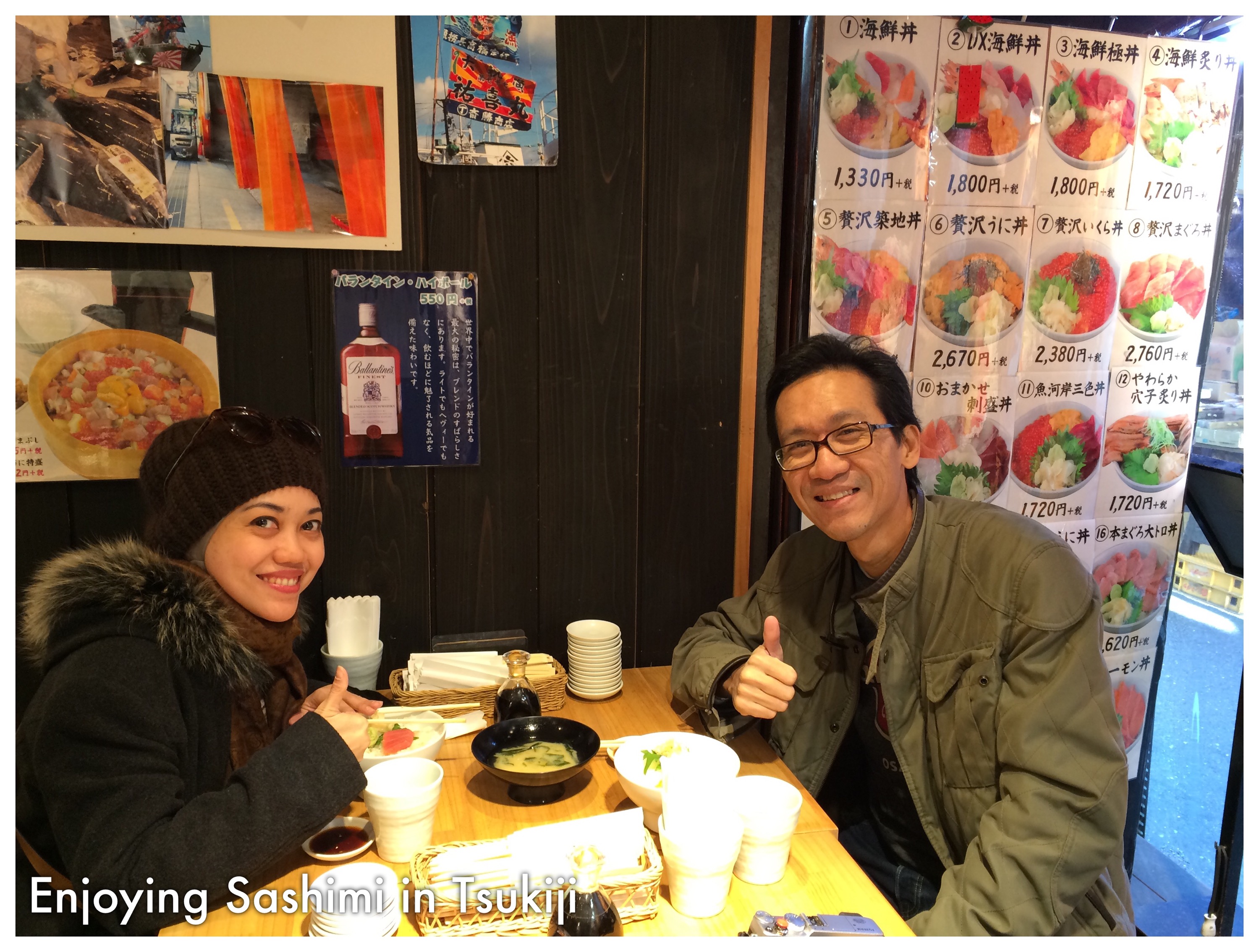 That’s why we came early this morning, as we read from the websites that the best time to enjoy these foods are in early morning. We arrived at Tsukiji at about 8am, and had a good look at various food stalls and sellers of exotic foods. It’s too bad the famous ‘tuna bid’ market was still closed for the tourists in December to January. But we came back happily from Tsukiji, as we just had one of the greak breakfast there, with one of the freshest salmon and tuna sashimi dishes we ever tasted. A time well spent 🙂