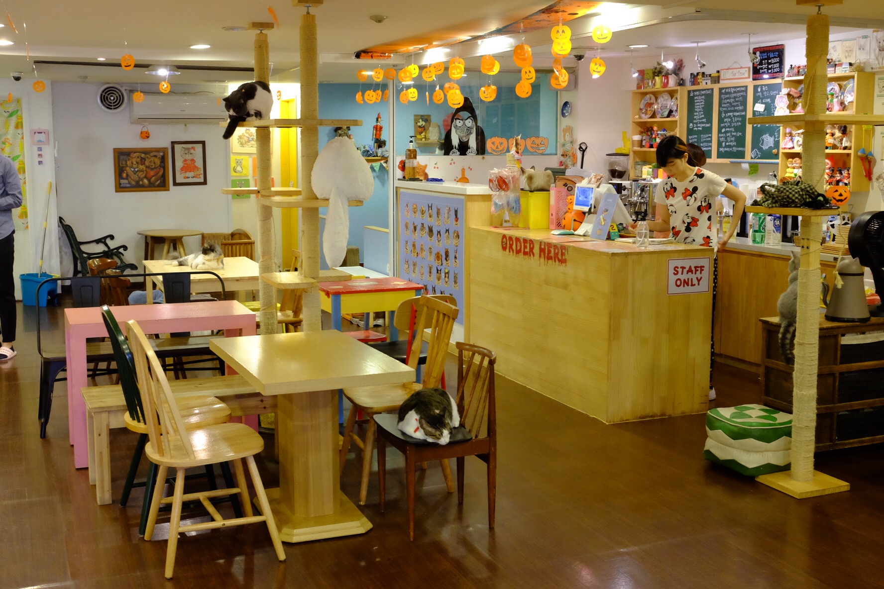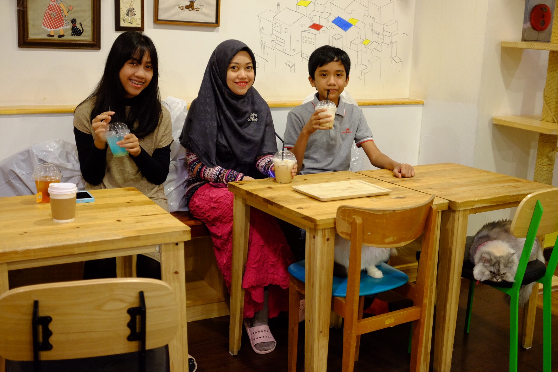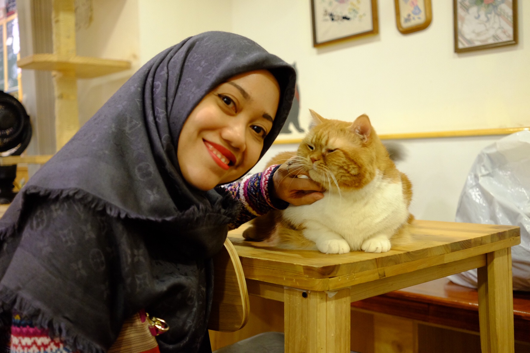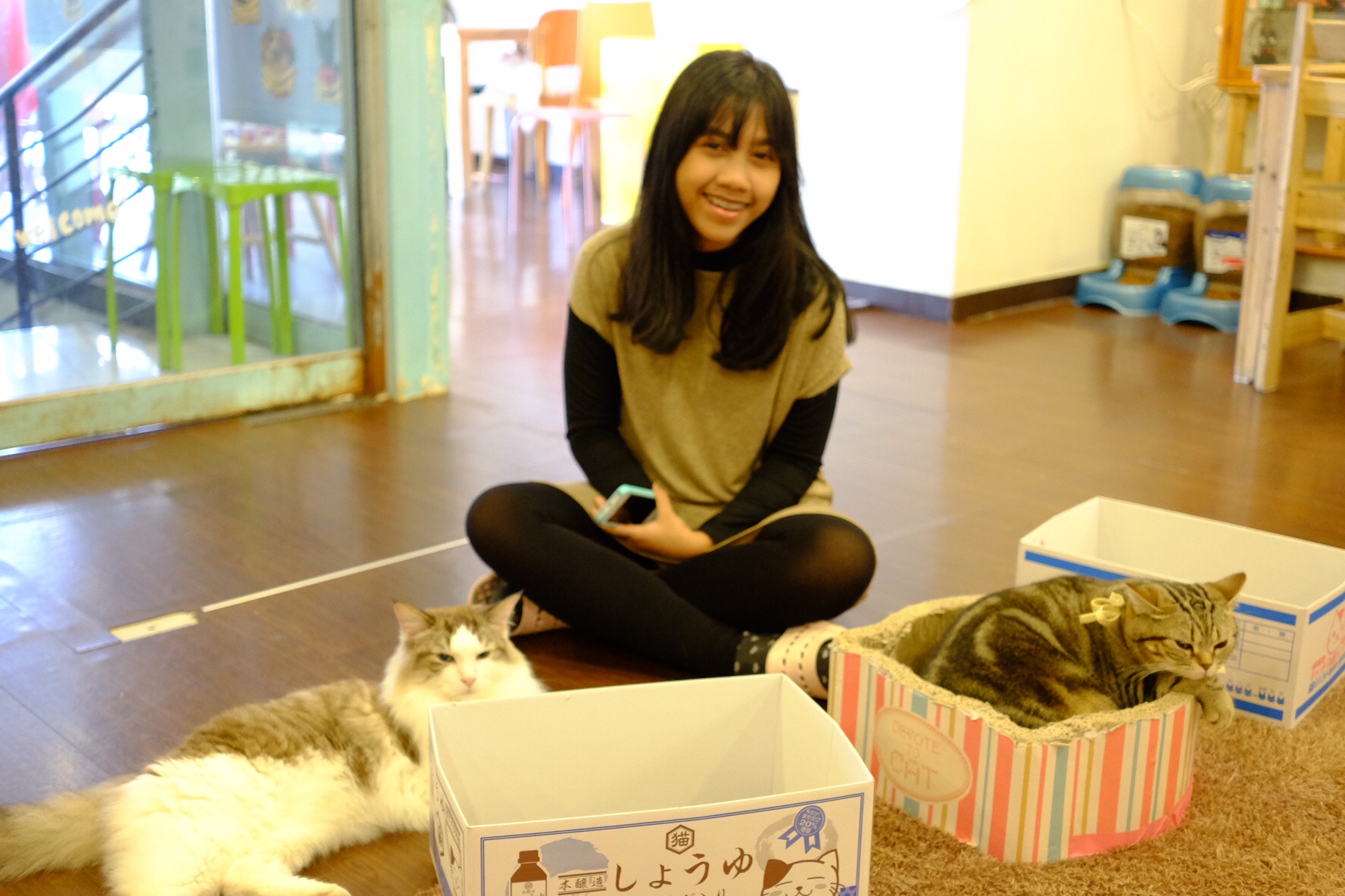 Rafif probably thought this was the best place he visited in Seoul! You can find many beautiful yet lazy cats here 🙂 Aya happily posed with those cats in the boxes The interior of Cat Cafe in Myeong Dong