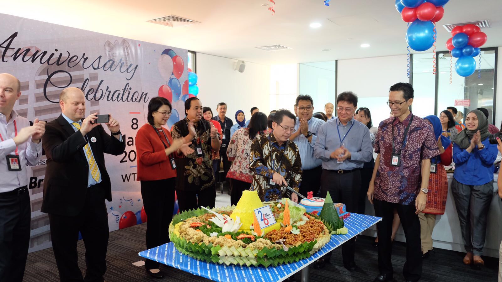Bank Ekonomi Raharja (BER) celebrates its 26th anniversary today for the first time in new office, World Trade Center I. The special morning started with coffee served by our own ‘BERista’ and continued with ritual Nasi Tumpeng and birthday cake decoration competition. Here are pictures from this morning’s event: