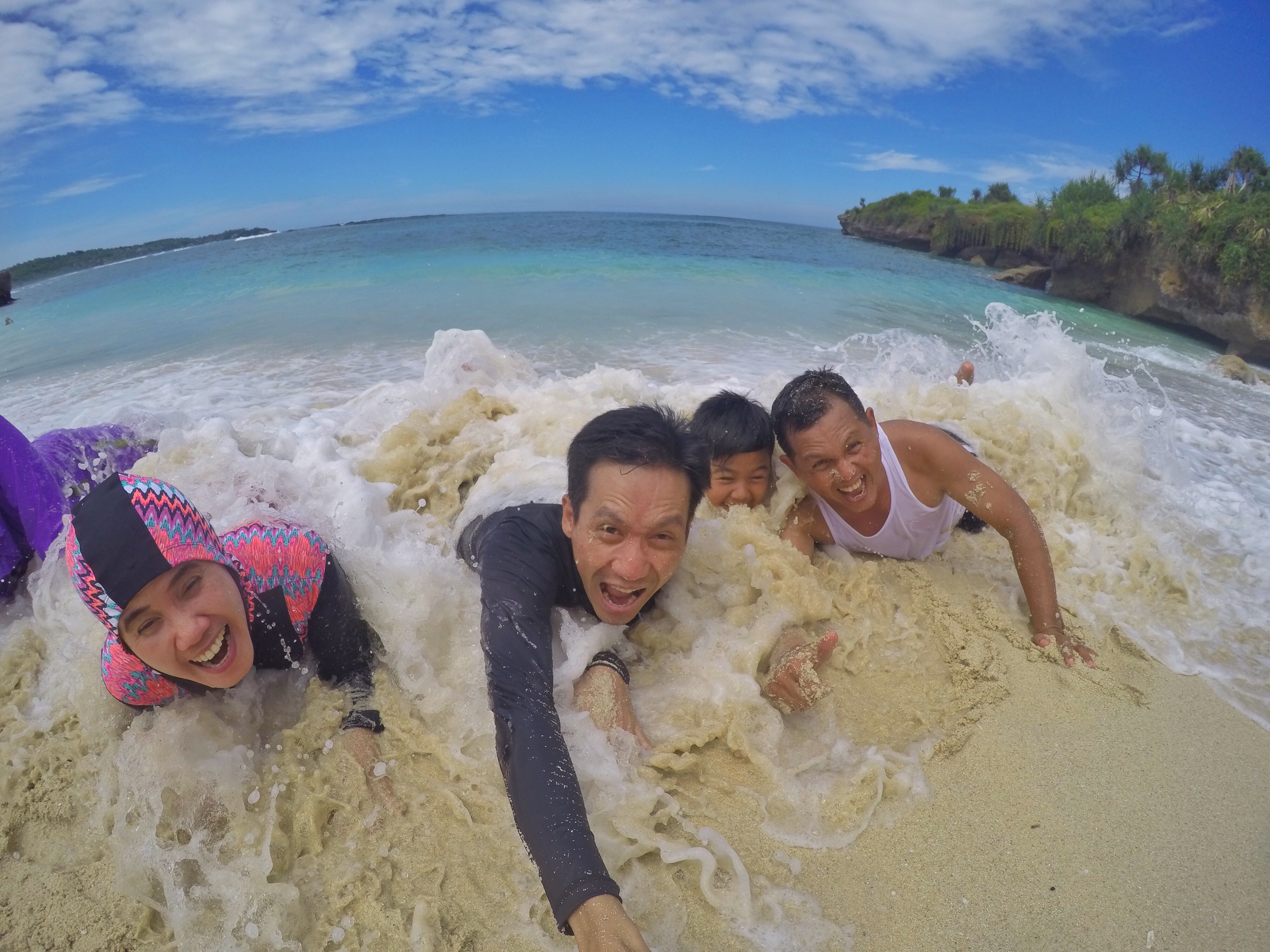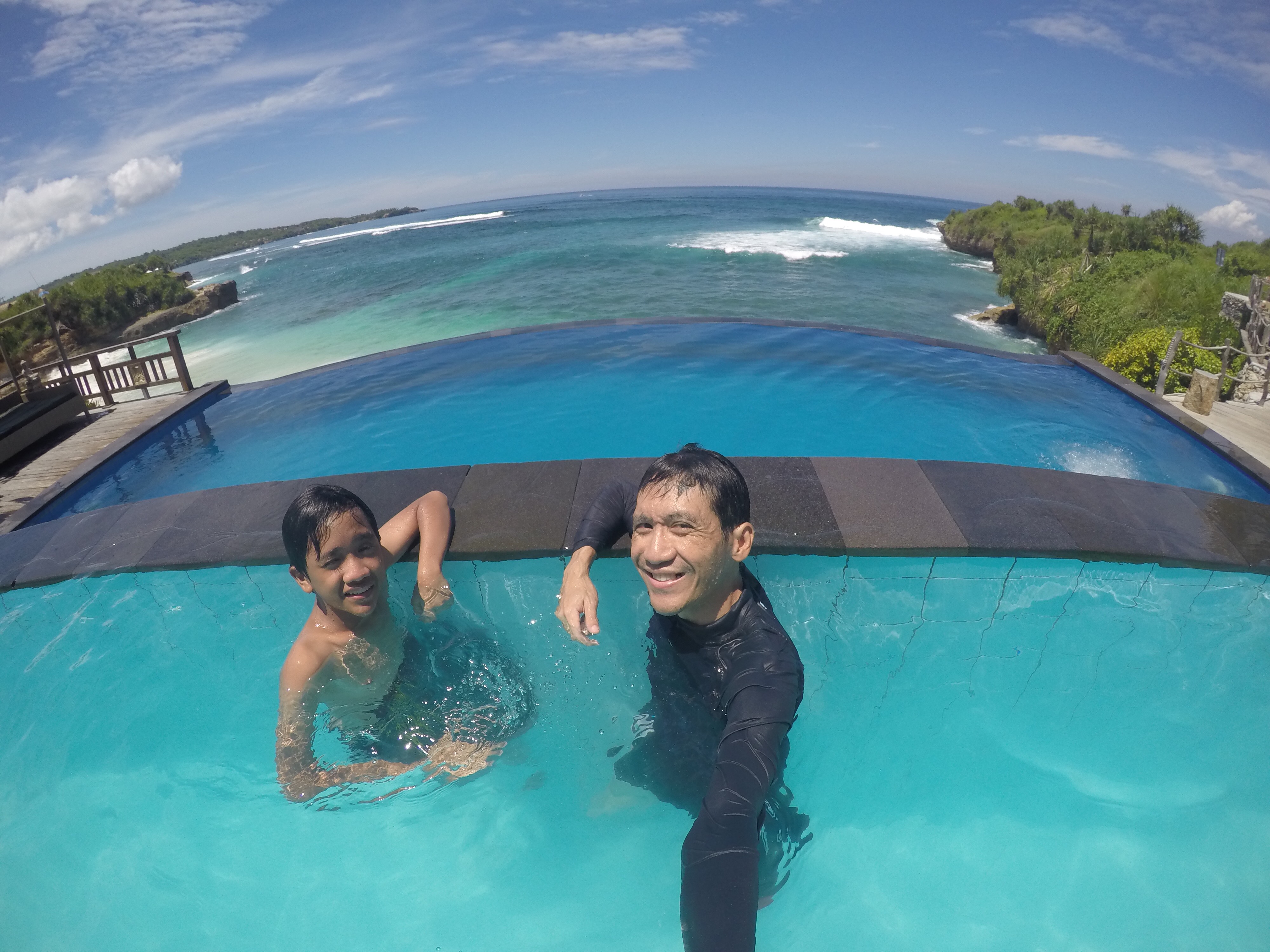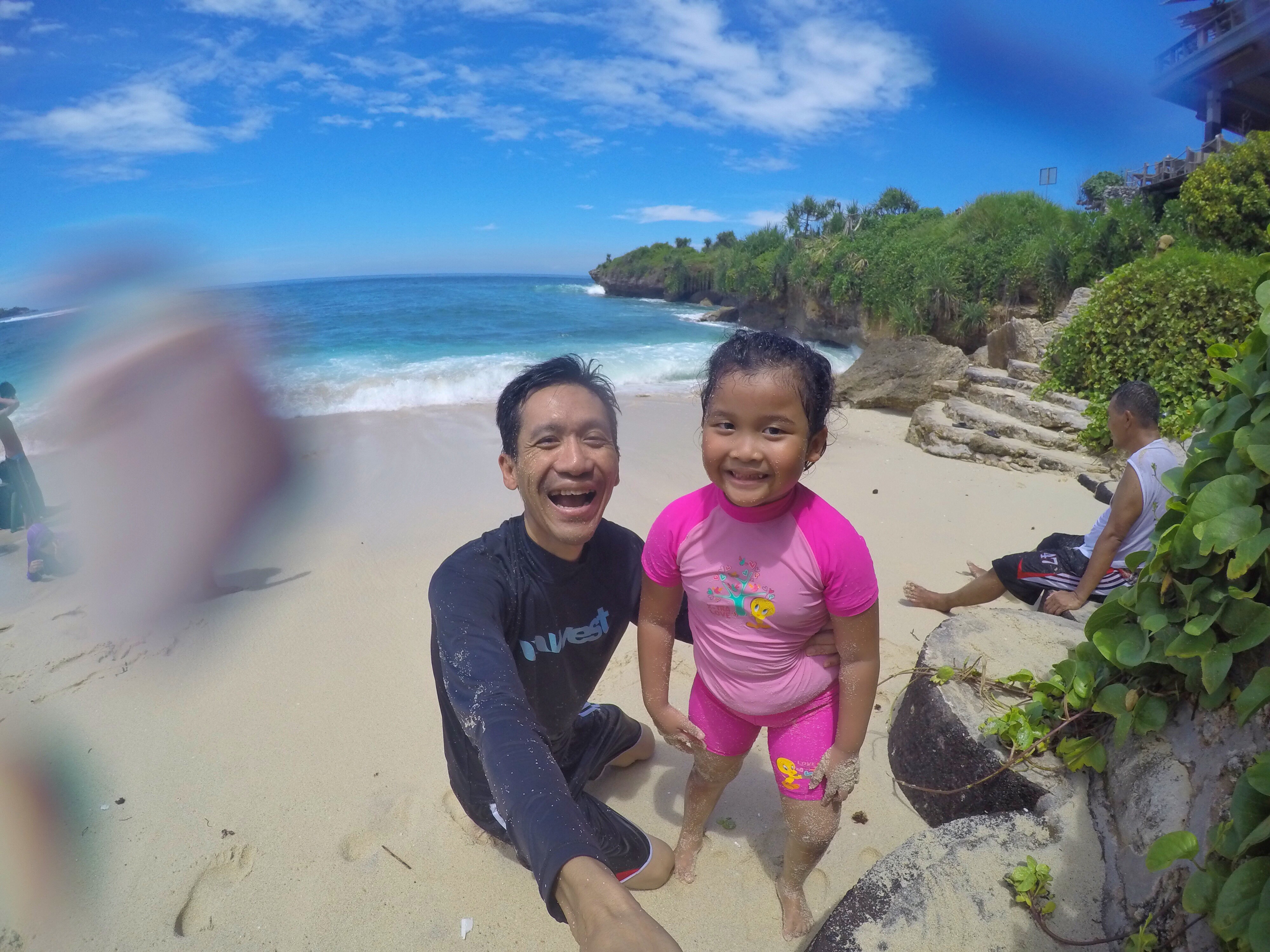 Determined not to take the mainstream tourist attraction, we took boat this morning going to Nusa Lembongan island, a small island off east coast of Bali. Our first destination in the morning was Dream beach. A beach nestled in between the cliff of Nusa Lembongan, and famous with its big waves. We had so much fun playing with the waves, adults in 40s and 50s turned like kids!