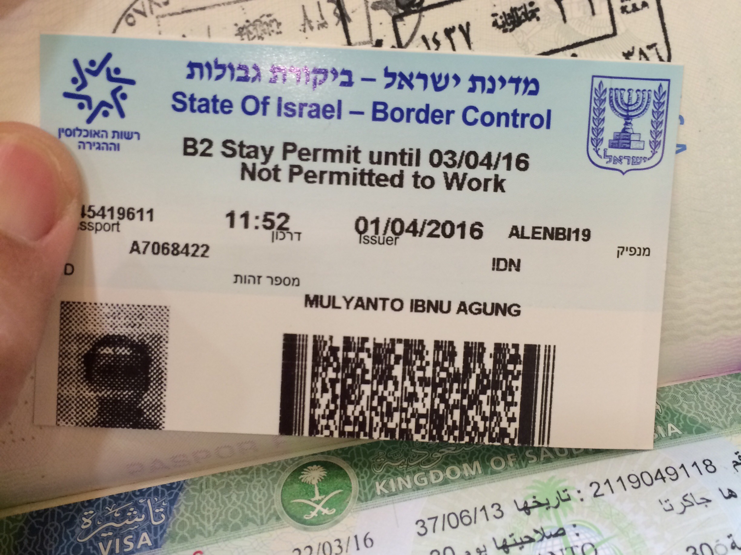 Tanda masuk Negara Israel yang diberikan saat lolos imigrasi. Jangan sampai ada cap dari Negara Israel di paspor Anda, atau Anda dapat ditolak masuk lagi ke Saudi Arabia!Tapi setelah masuk ke dalam negara ini, dan berada di kota Jerusalem, everything looks normal. Well, except for some of Israeli police guards in almost every corner of the city, carrying big guns 🙂 (lihat gambar di bawah)