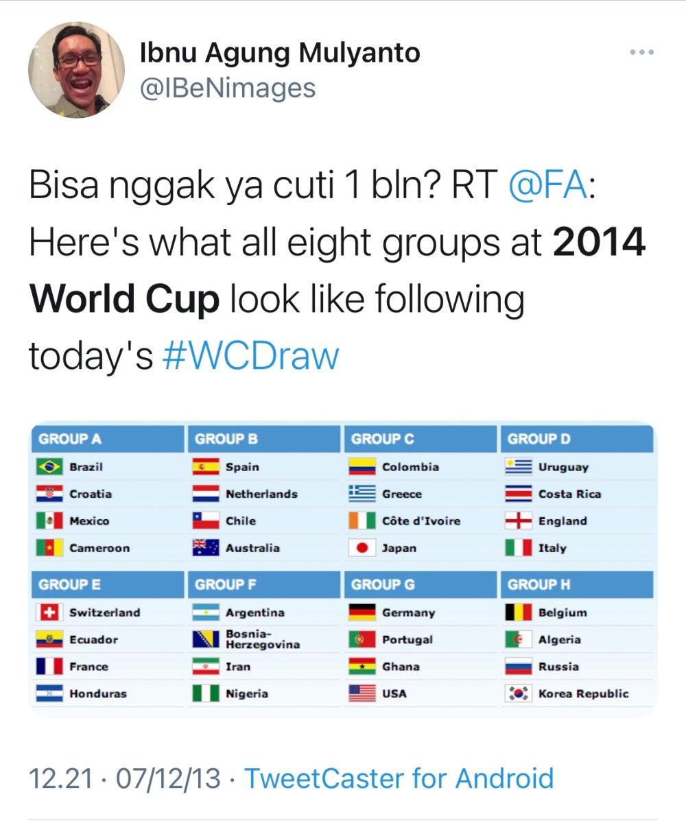 3 tahun yang lalu, akhir tahun 2013, menghayal untuk dapat libur 1 bulan di bulan Juni-Juli 2014 untuk dapat nonton World Cup 2014. Sempat men-tweet hayalan ini.