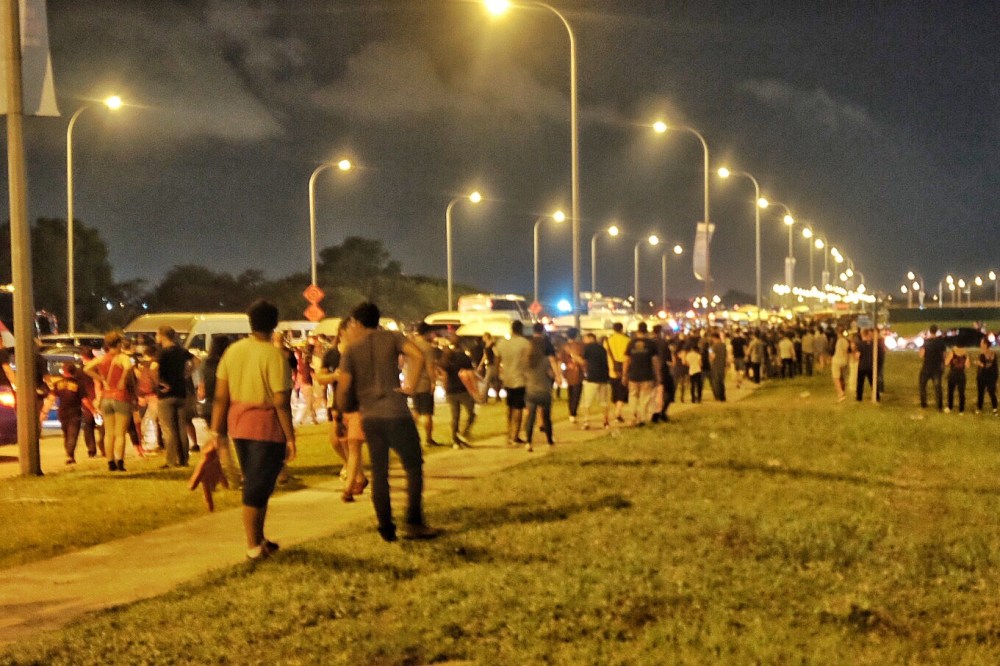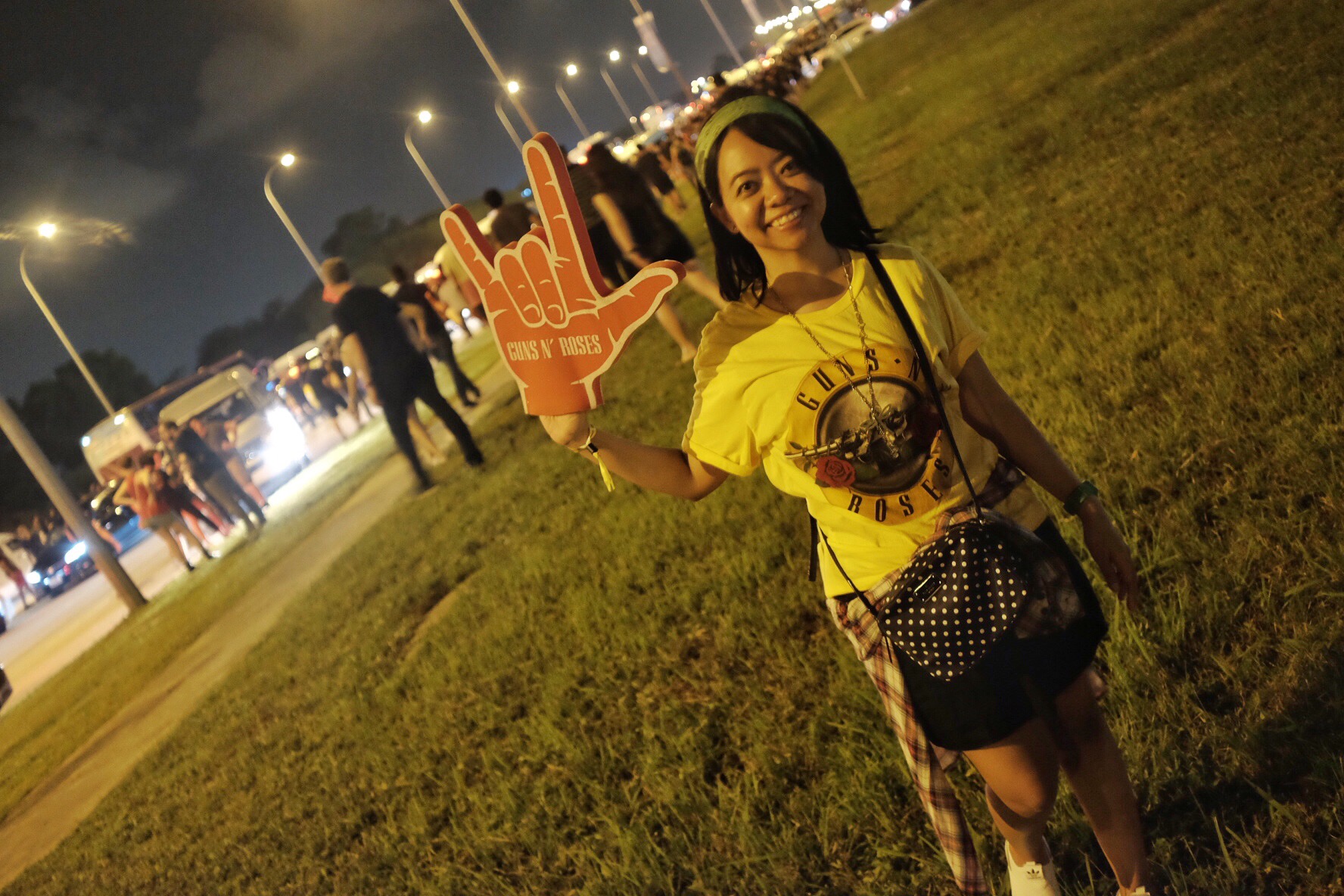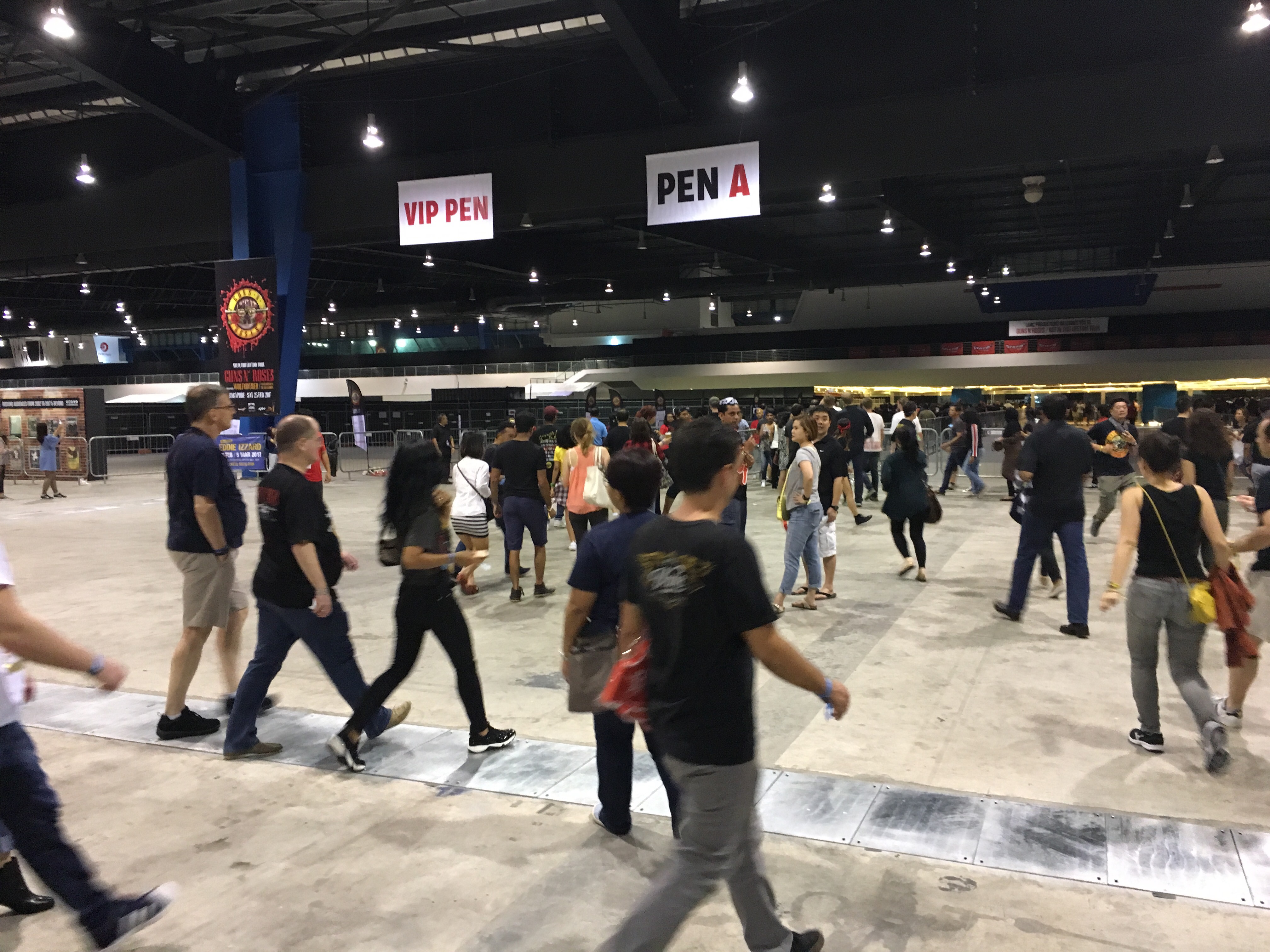 And on our way to the concert place in Changi Exhibition Centre, we immediately saw the effect. Long traffic jam leading to the place. We drove for 1.5 hours from downtown to arrive at our destination. The GNR show started at 8 pm and we arrived around 7.40 pm. And judging from the long traffic jam, I was sure many people who didn’t come early would be late as they stuck in the unanticipated traffic jam (well, Singapore is never known for traffic jam, really). Many of the fans stopped and parked their cars along the road and ran towards concert place in hurry. “Never seen anything like this before”, said my friend who had attended number of musical concerts here.