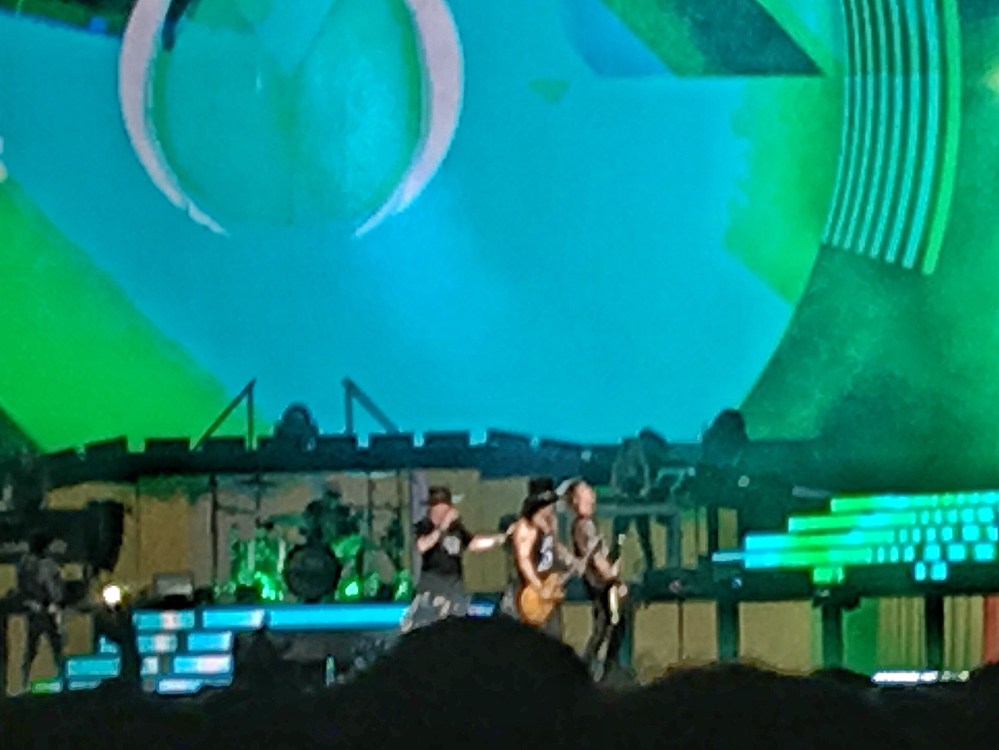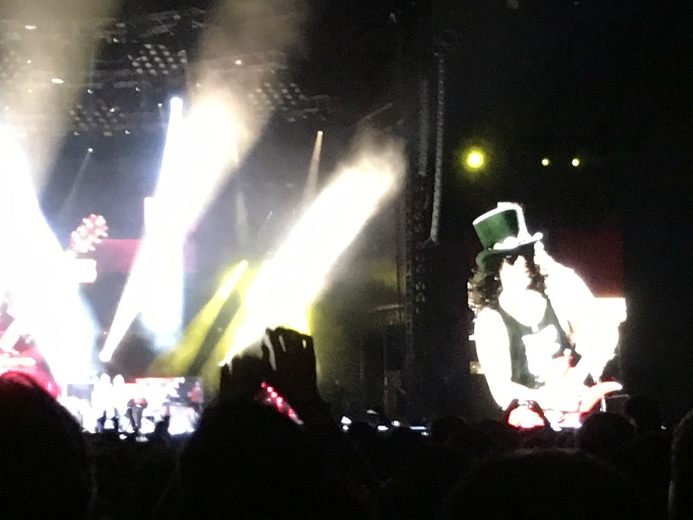 From Duff’s shirt text (“Street Walking Cheetah”), Slash’s various Gibson modelsguitars to Axl’s very expensive HYT watch. So although the band members look tiny, we didn’t miss a lot of what happened on stage.