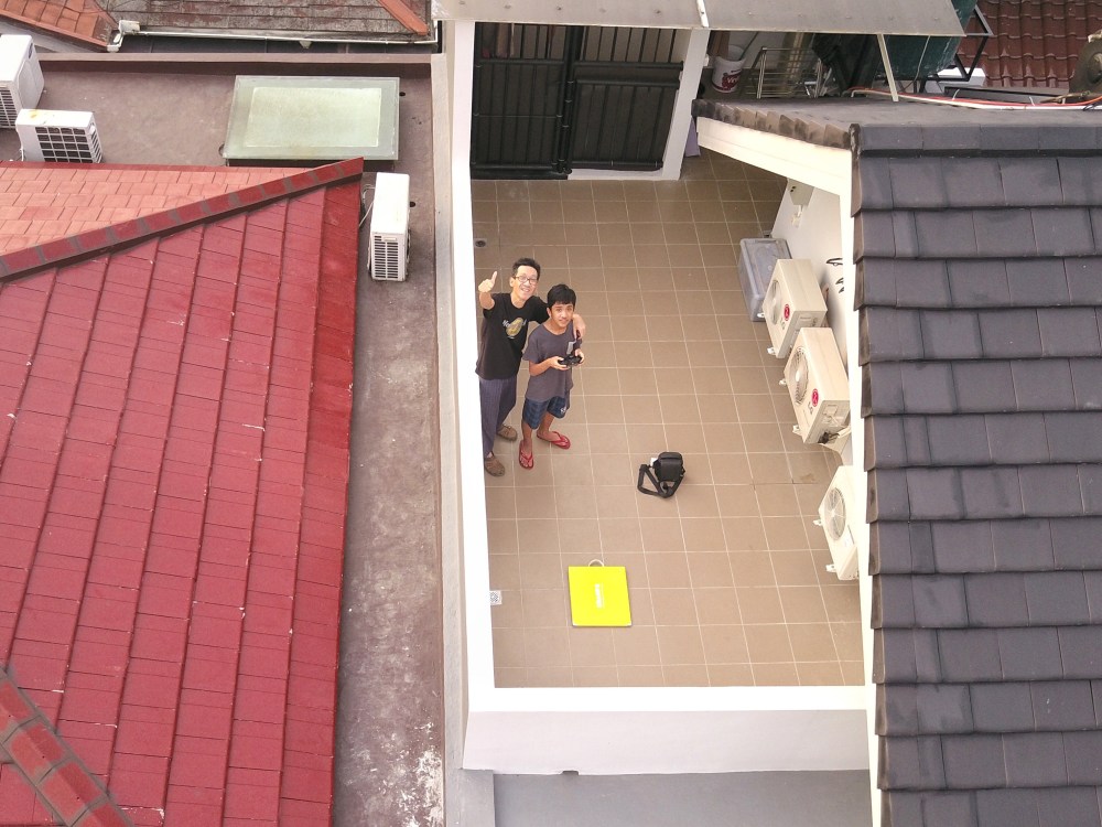 Anyway, I and Rafif continue to learn how to fly Pelican, our drone. Taking off from our roof top, it was much more delicate take off and landing procedures than in swimming pool area, given relatively narrow area (that yellow pad is the drone landing pad). But thankfully, we managed to complete the task safely.