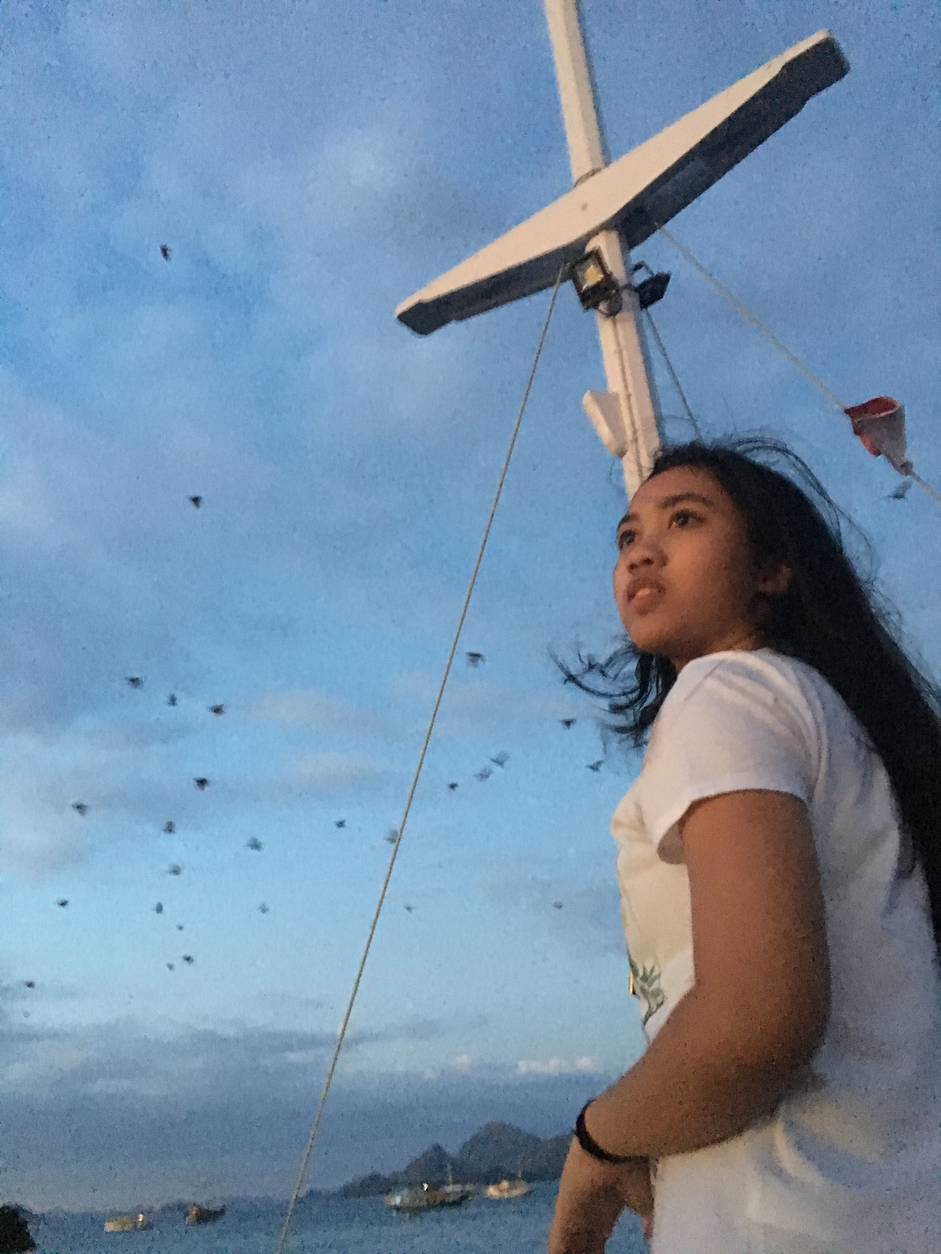 Aya and Elok enjoy their coffee by the deckAya waiting for sunset with her phoneClock does feel like slowing down here. And while we’re waiting for sunset, we saw one of the most amazing view we’ve ever seen: thousands of bats flying on the top of our boat, right after the sun is set. Amazing! Indonesia is really amazing! This experience can easily be marketed as world class tourist destination, as in Penguin watching in Phillips Island, Australia. Simply breathtaking. What a day we had here.