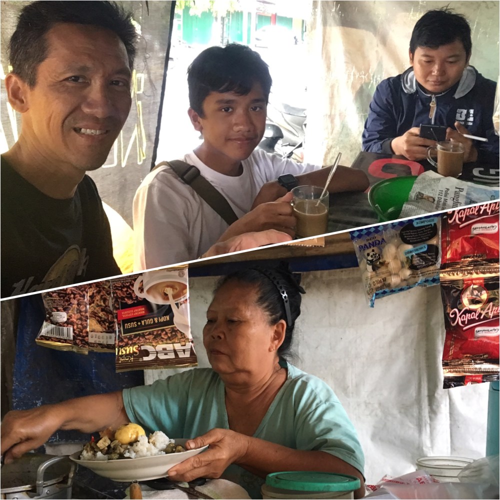 Took Rafif this morning for experiencing breakfast at Jogja style”Angkringan“. Angkringan is a small off the street food tent, normally sits on the pedestrian walk. Opened from late evening to early morning, these