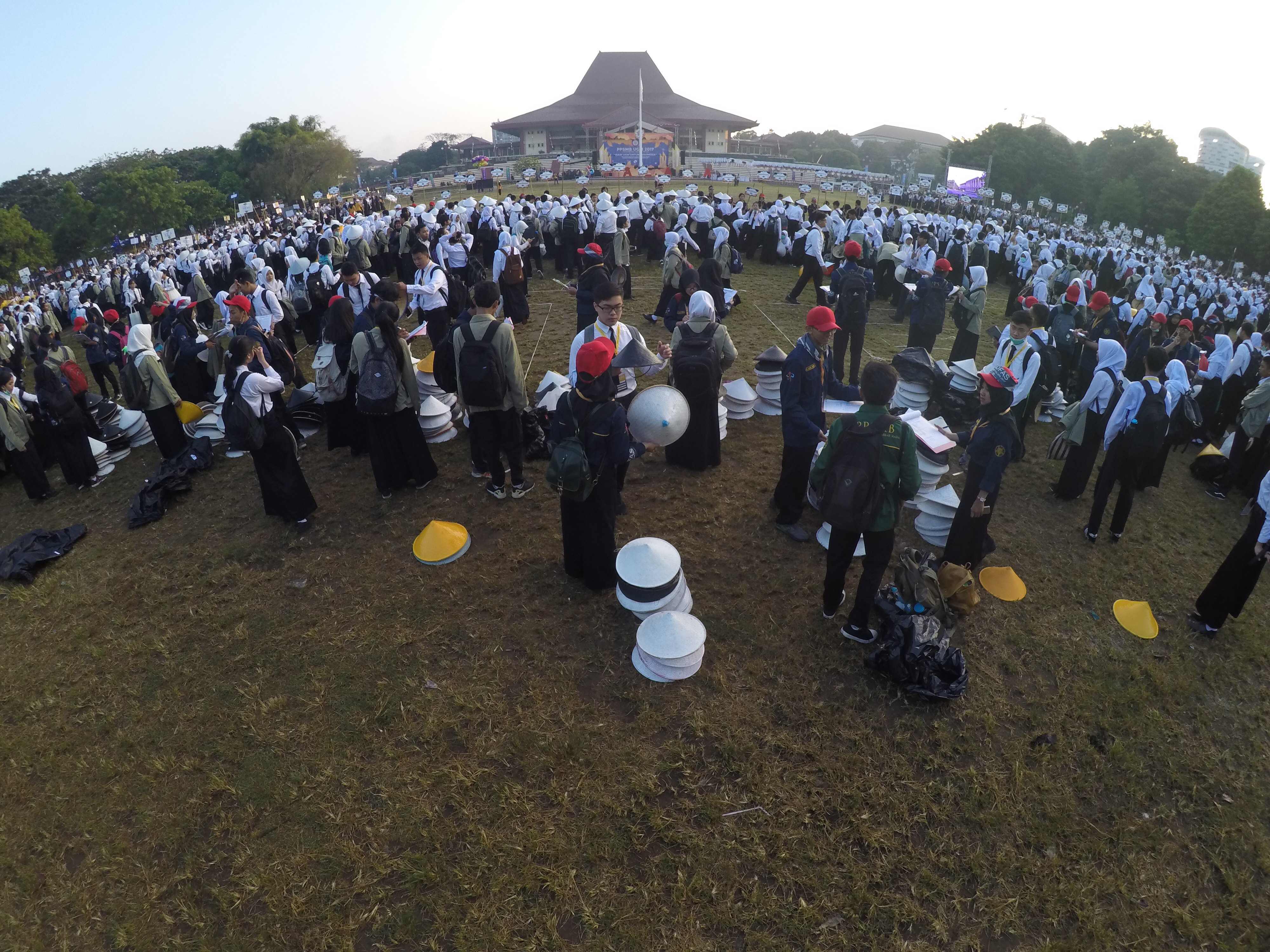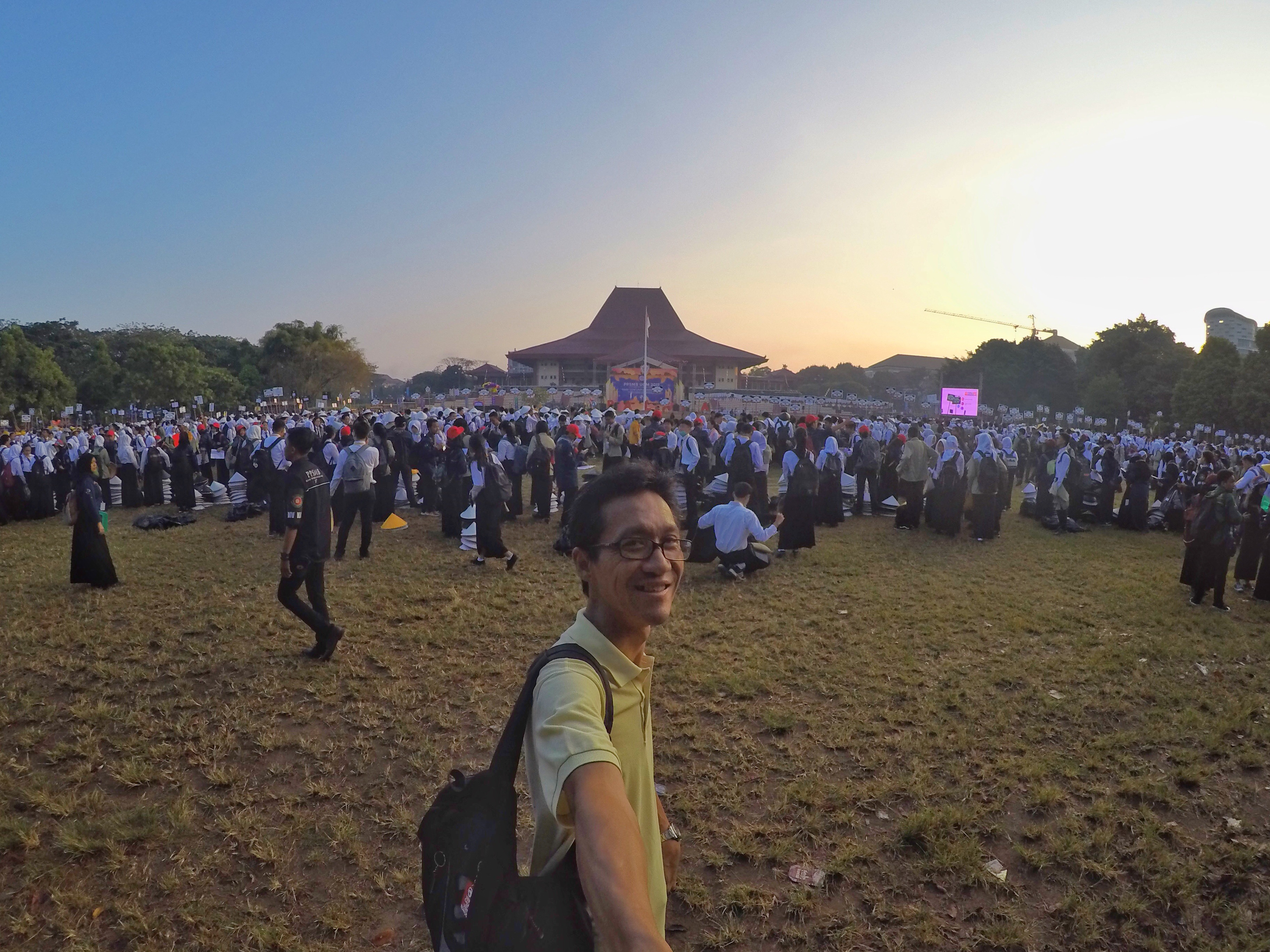 I’m driving Aya to Bulaksumur, Jogja, this morning, taking her to inauguration day for Gadjah Mada University (UGM) new students. She joined with 8000+ other new students at Grha Sabha Pramana field (GSP), right in the center of campus for the first day of Pelatihan Pembelajar Sukses Mahasiswa Baru UGM (orientation training)
