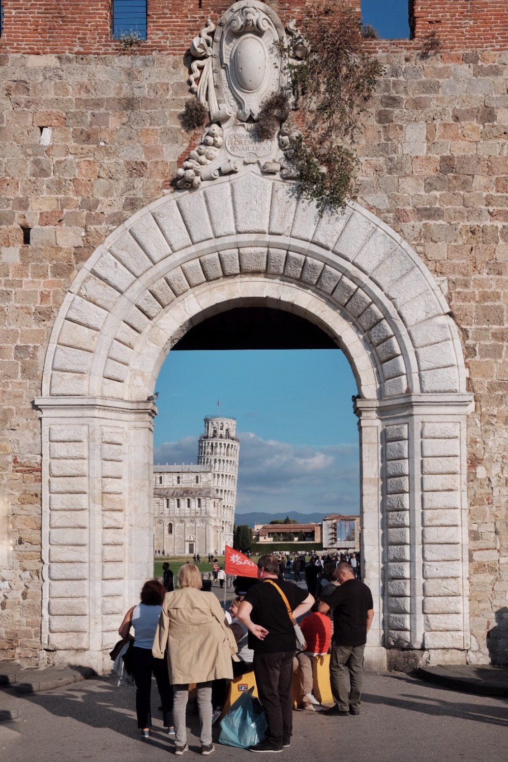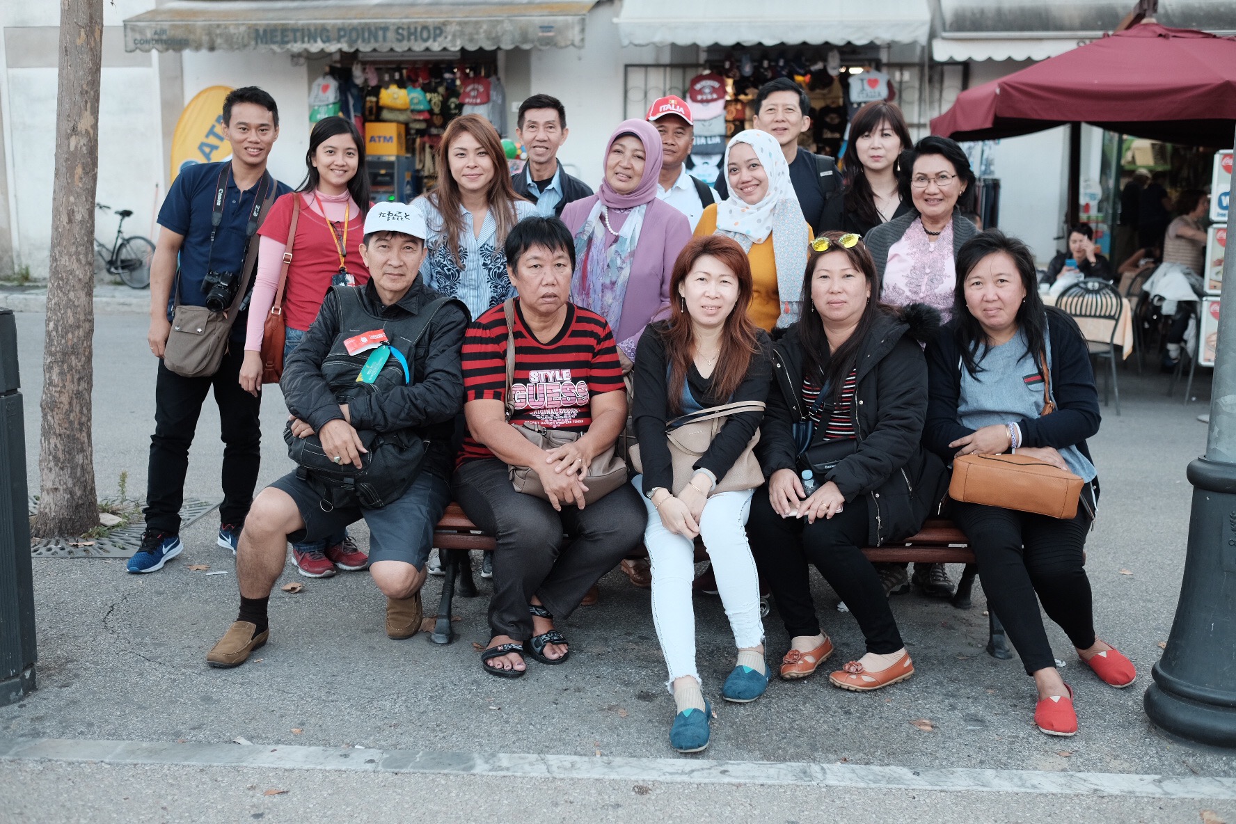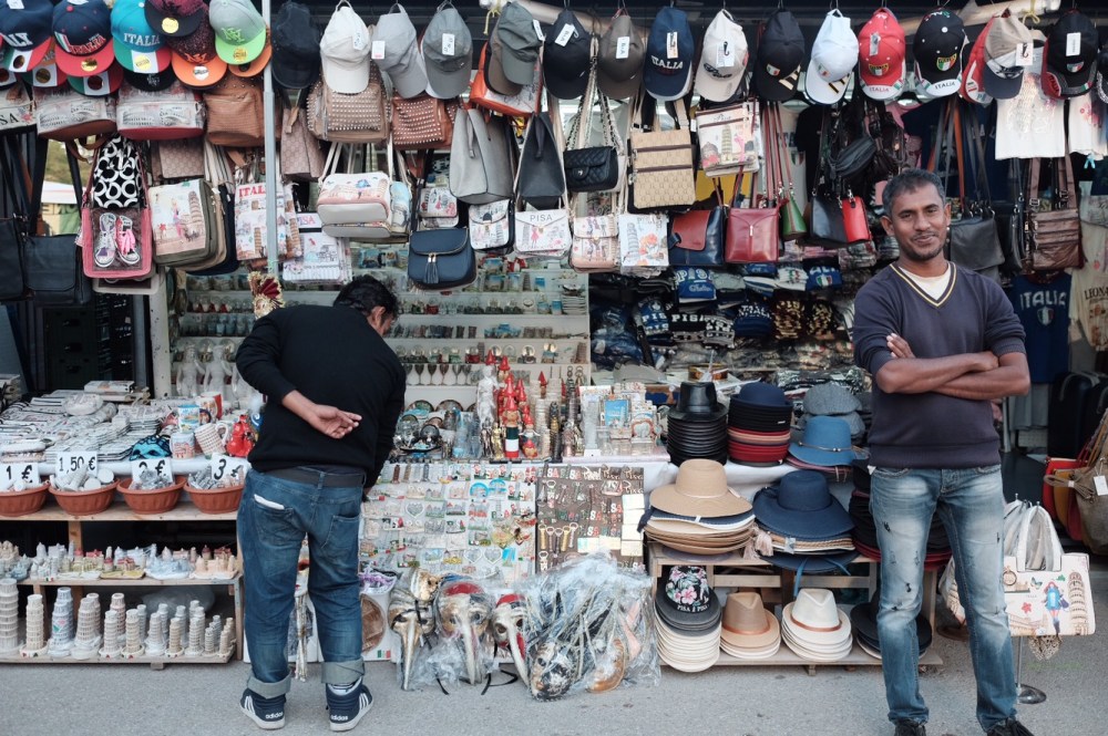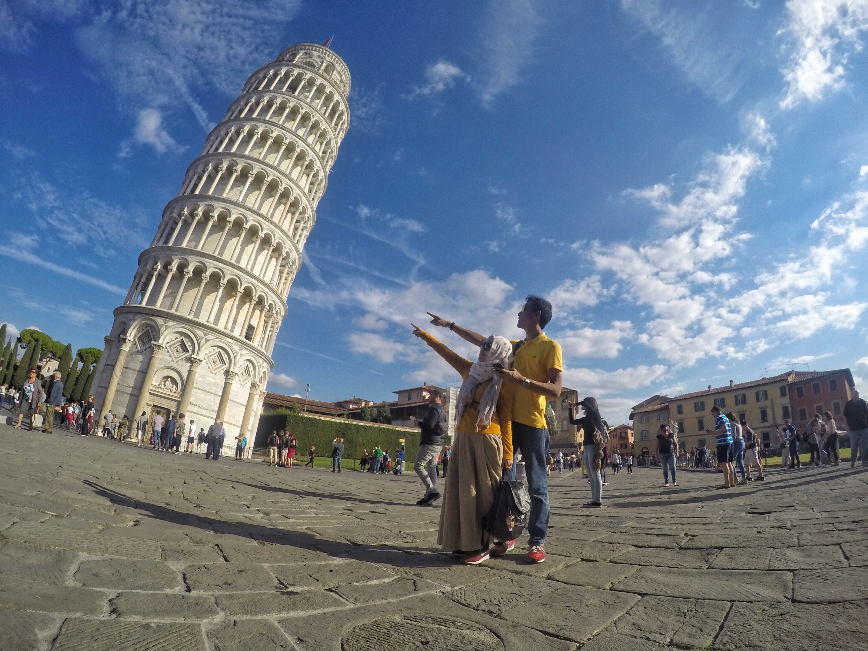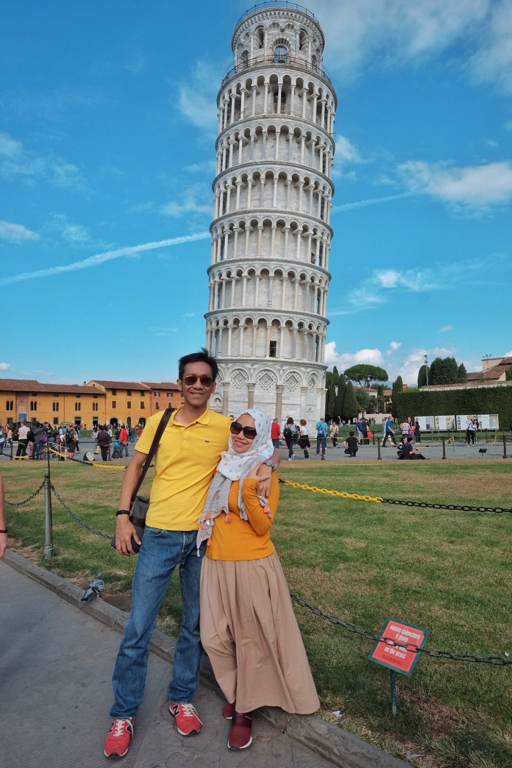 Our pose with the leaning tower 🙂Familiar scene here: tourists work with their photographer to strike the best and unique pose with the tower 🙂Yes the wide angle lens make it much more tilted. But believe me, it’s really look like about to crash to the ground! 🙂The couple in yellow today, with the famous Pisa landmarkElok is trying to capture her mom’s pose with the towerThe leaning tower as seen from the main gateThe souvenirs seller. Most of these are immigrants. This guy is Bangladeshi, and greeted us with Assalamu’alaikum and “Murah, Murah!” in Bahasa. LOLOur group, shortly before leaving Pisa