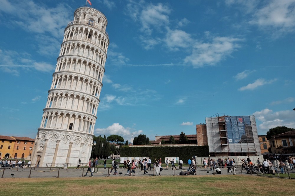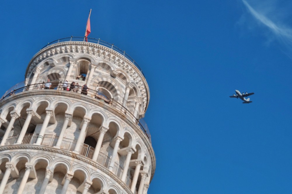 The top of Pisa tower, with a plane flying byThis landmark needs no introduction. Almost everyone knows it. The 55 meters tower was started to be built in 12th century. Because of an inadequate foundation on ground (it’s too soft on one side to properly support the structure’s weight), the tower tilted and the tilt increased in the decades before the structure was completed in the 14th century. Thanks to modern day technology, in 21st century, the structure is now stabilized to avoid further tilt.