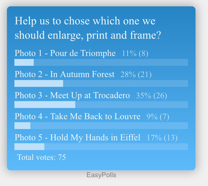 “In Autumn Forest” got the second most votes (28%), as some of voters said the “expression was the best”, but did not get the win because it “didn’t show enough of Paris” (even my brother said it looked like a shot taken in Cibubur! LOL)
