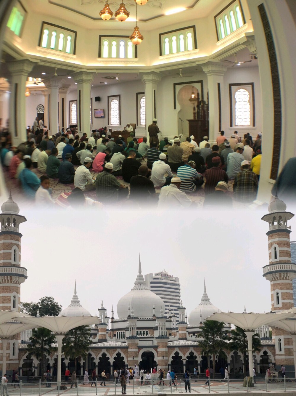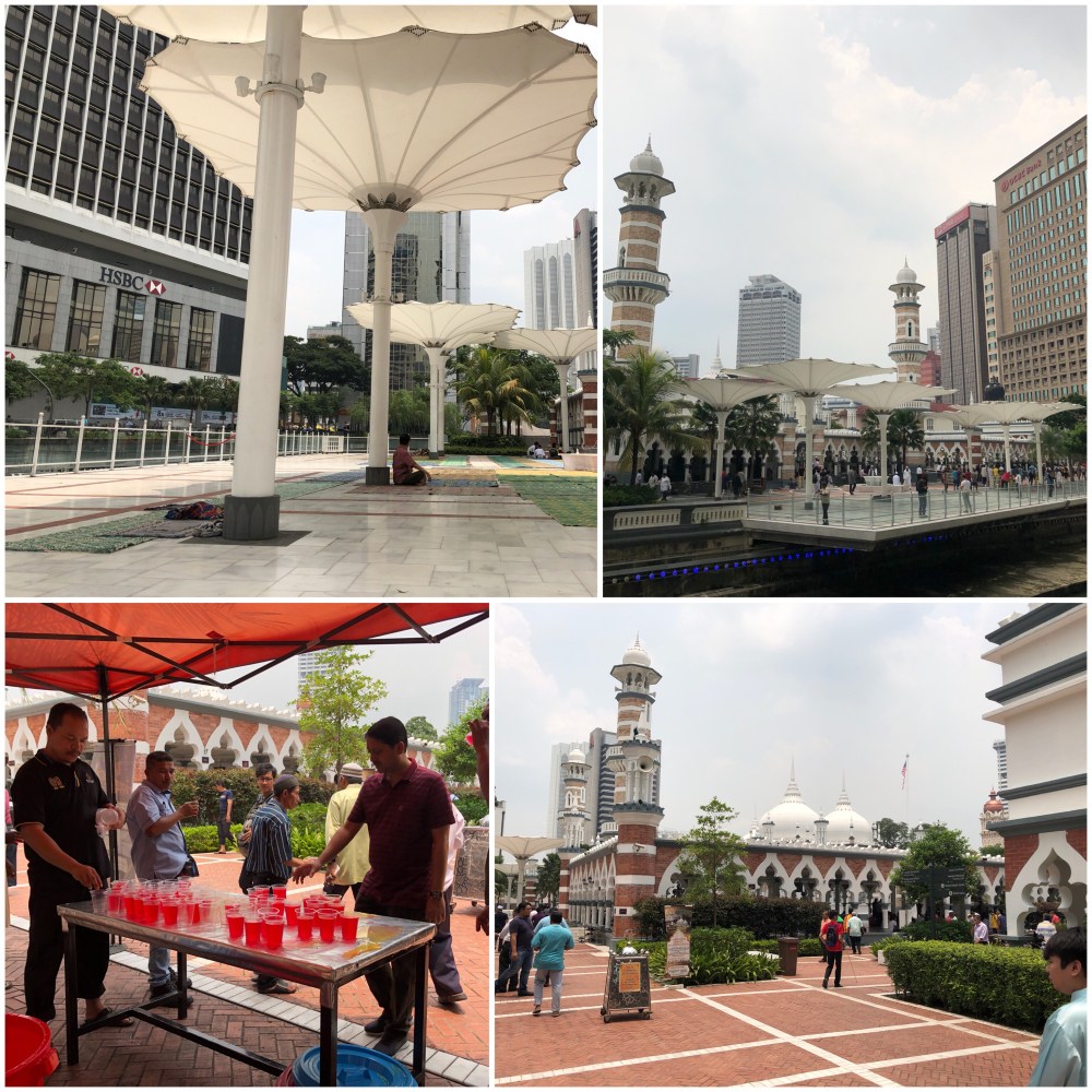 The historic Masjid Jamek is just next to my office’s building, so it’s really convenient for me to walk and do my Friday prayer there. The mosque complex is not too big, however it is really convenient. The main prayer hall is air conditioned, but the mosque terrace is clean and neat with prayer mats available in every corner. They also serve ‘welcome drink’ for visitors which I found very refreshing. The prayer started at 1.19, which means we started the Friday prayer almost at the same time with Jakarta’s moslem did theirs. So why +1 time zone, eh? Wallahualam 🙂