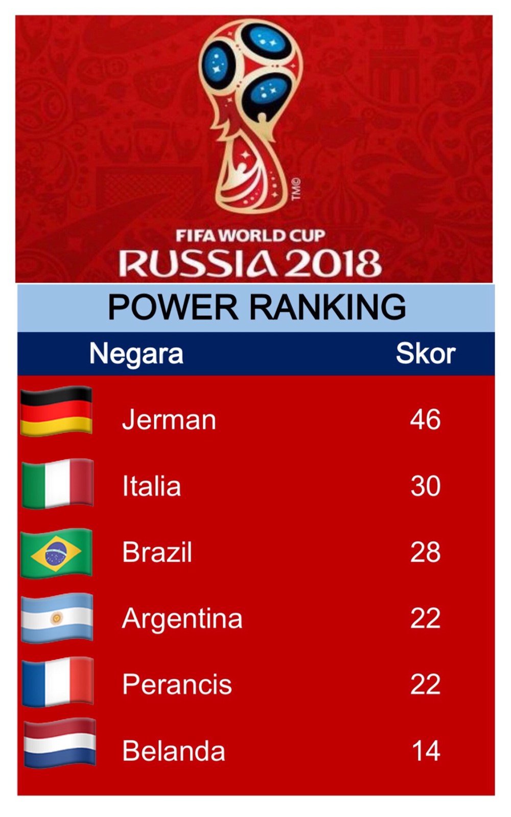 Yang kemudian menghasilkan Power Rankings Piala Dunia sebagai berikut: