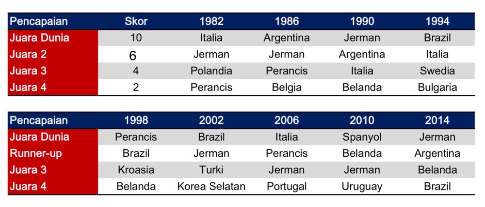 - Dari tahun 1982 sampai 2014, tidak ada penyelenggaraan Piala Dunia tanpa Jerman atau Brazil sebagai semifinalis. Nah kalau lihat data historis seperti ini, kalau mau menjagokan 2 negara di Piala Dunia mendatang, pilih Brazil atau Jerman. Insya Allah salah satu atau keduanya masuk semifinal!