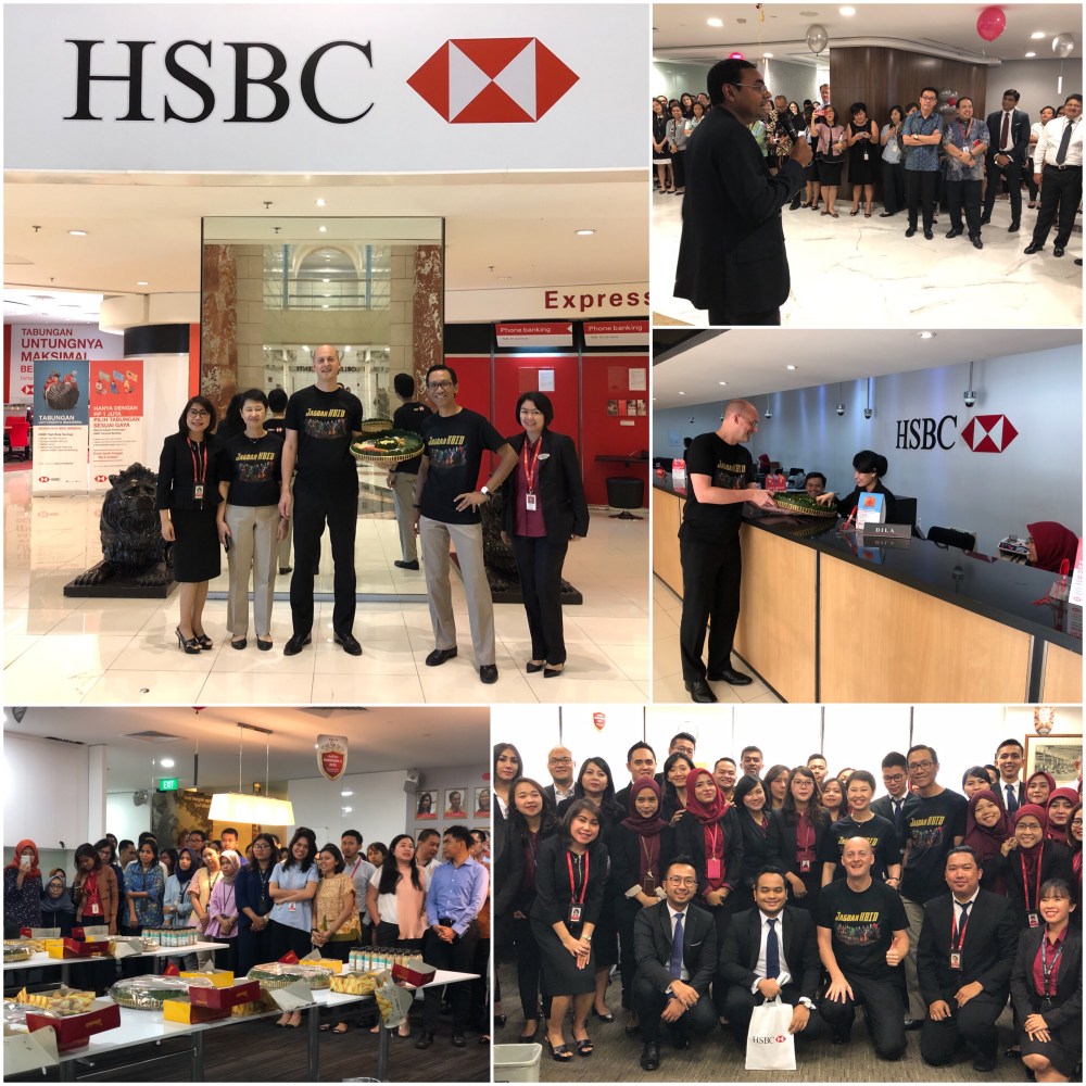 Today marks 1 year of successful integration of my office, HSBC Indonesia. To celebrate this historic milestone, since yesterday, Board of Directors and Management Committee of the bank walked around the floor of our headquarters and branches, shaking hands with the staff, saying thank you for the hard work and their support throughout the challenging year, pre and post integration. While it was tiring for us to walk in all 11 floors in two headquarter buildings yesterday, but it was enjoyable and rewarding at the same time, to see many “Jagoan HBID” are all in great spirit.