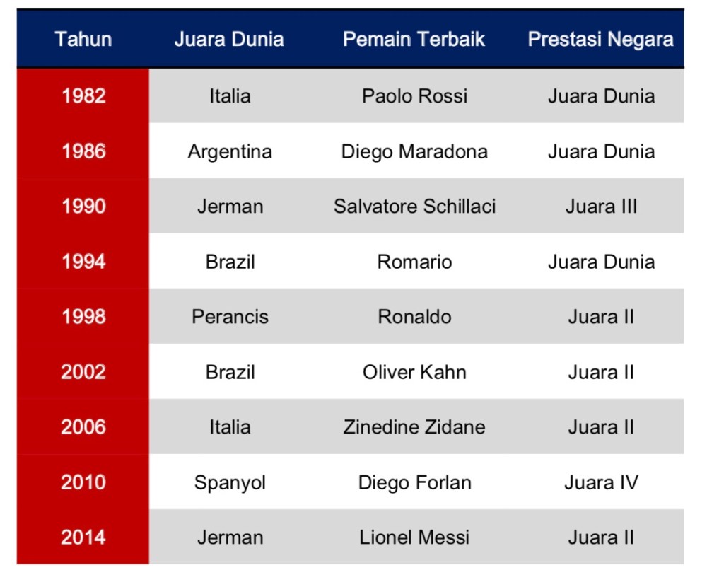 Begitulah fakta yang terjadi. Sejak Piala Dunia tahun 1982, terhitung hanya 3 orang peraih piala Golden Ball (piala untuk pemain terbaik sepanjang turnamen) yang negaranya juga berhasil menjadi Juara Dunia. Mulai dari Paolo Rossi saat Italia Juara Dunia tahun 1982, Diego Maradona saat membawa Argentina Juara Dunia tahun 1986, dan terakhir Romario, saat mengantarkan Brazil juara di tahun 1994.