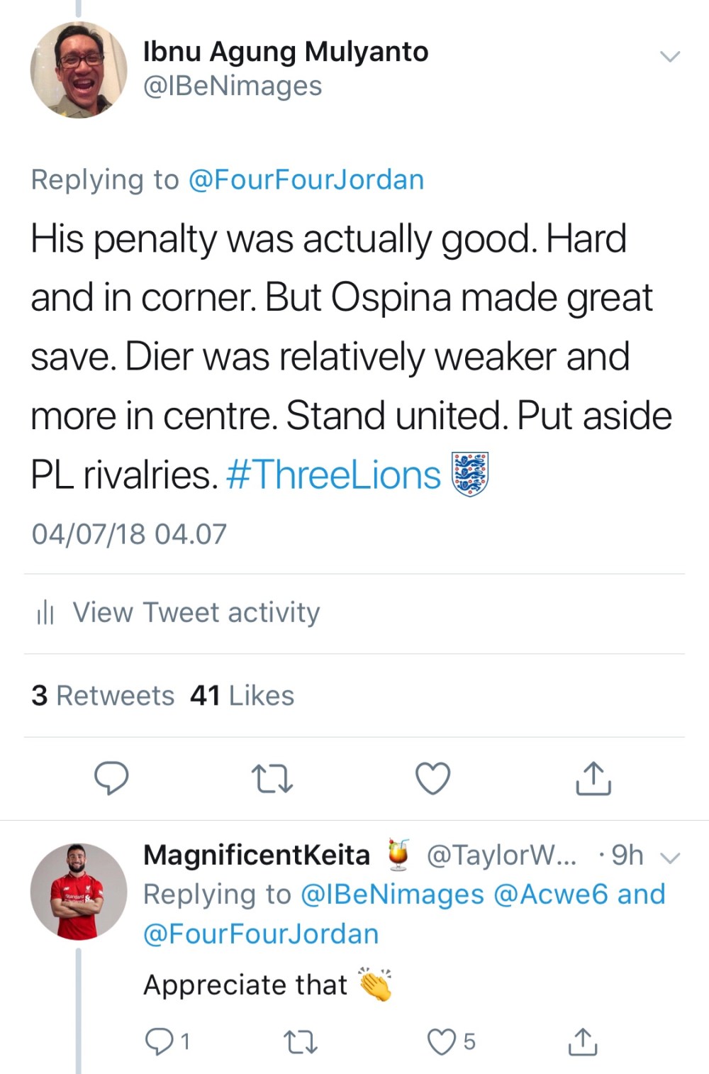 Tapi ternyata sampai akhir masa perpanjangan waktu Kolombia tidak bisa membobol gawang Inggris. Saat peluit panjang dibuntikan, saya sudah pasrah. Mengingat rekam jejak Inggris, saya juga tidak menginginkan adu penalti. This is all the same situation that we’re familiar with. Saya tulis di Twitter: