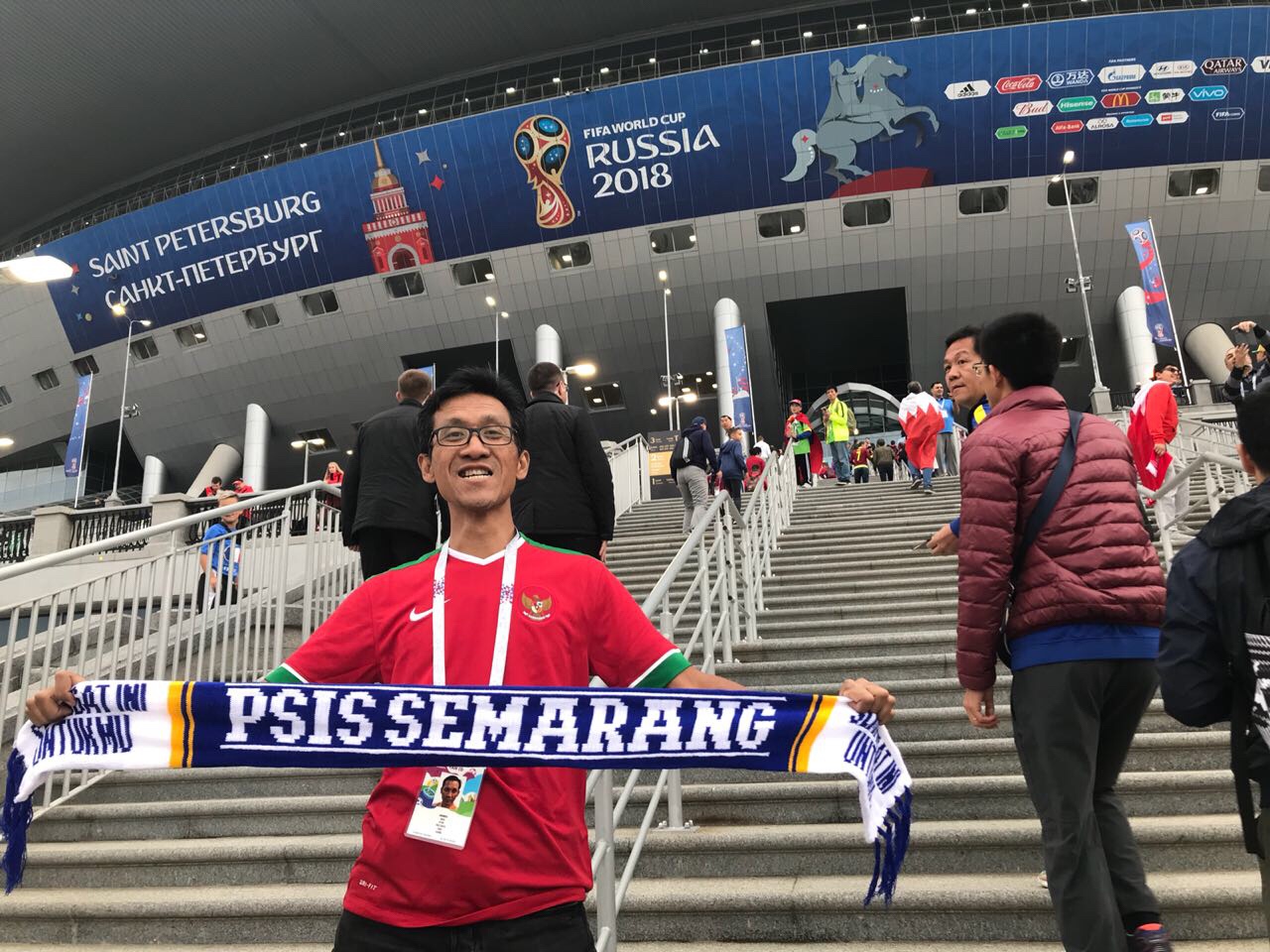 Sampai ke dalam halaman stadion, saya menyaksikan kembali karnaval sepakbola. Ribuan fans sepakbola datang ke St. Petersburg dengan atribut sepakbola negaranya. Tidak peduli negaranya sudah gugur di babak sebelumnya, ataupun tidak mengikuti Piala Dunia (heloo, saya saja pakai jersey Indonesia?), semuanya dengan bangga mengenakan jersey sepakbola negara mereka, sebagai lambang identitas.