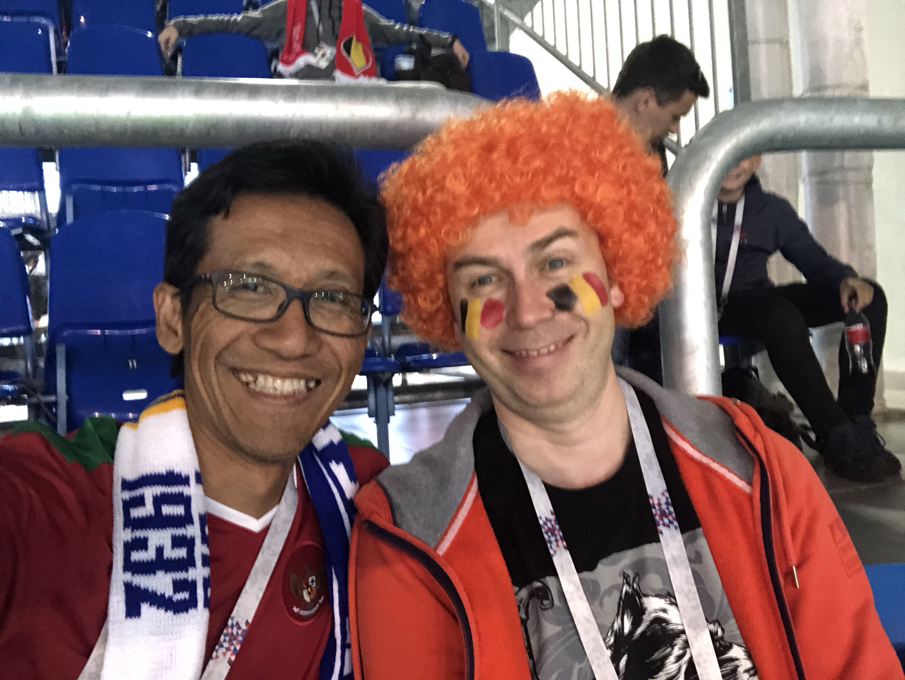 Di dalam stadion, saya duduk di sebelah seorang penonton warga Russia asli St, Petersburg. Namanya “Andrei”. Awalnya, saya kira ia adalah orang Belgia karena mengenakan wig kribo ala Fellaini dan jersey Belgia.