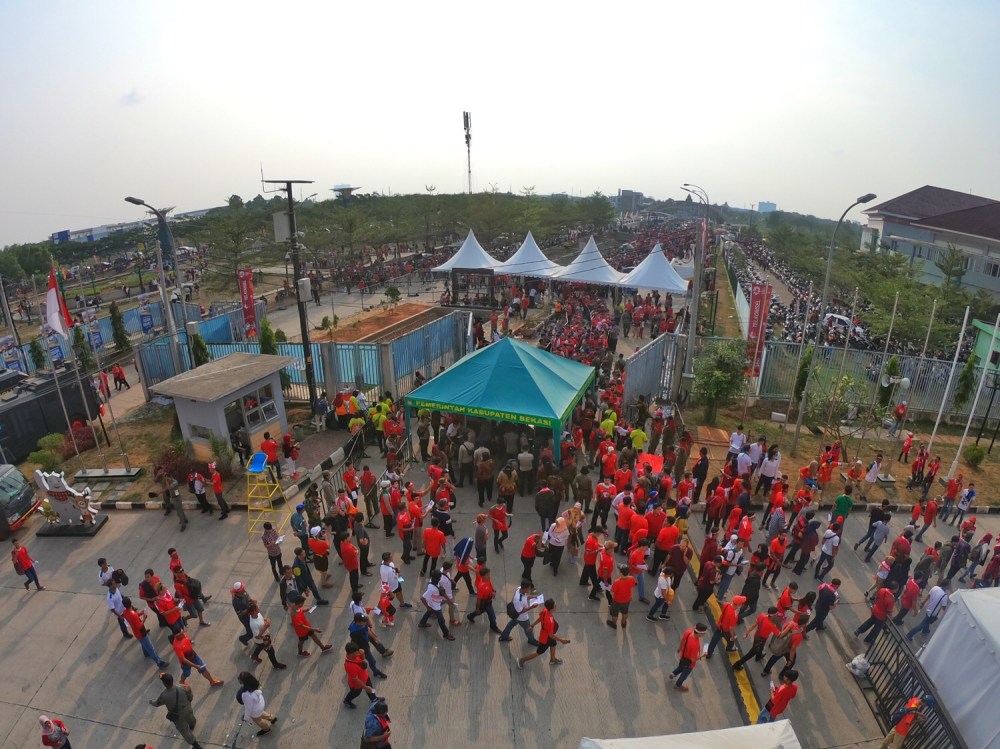 Antrian di depan Stadion Wibawa Mukti, yang terletak di Jababeka, Cikarang: