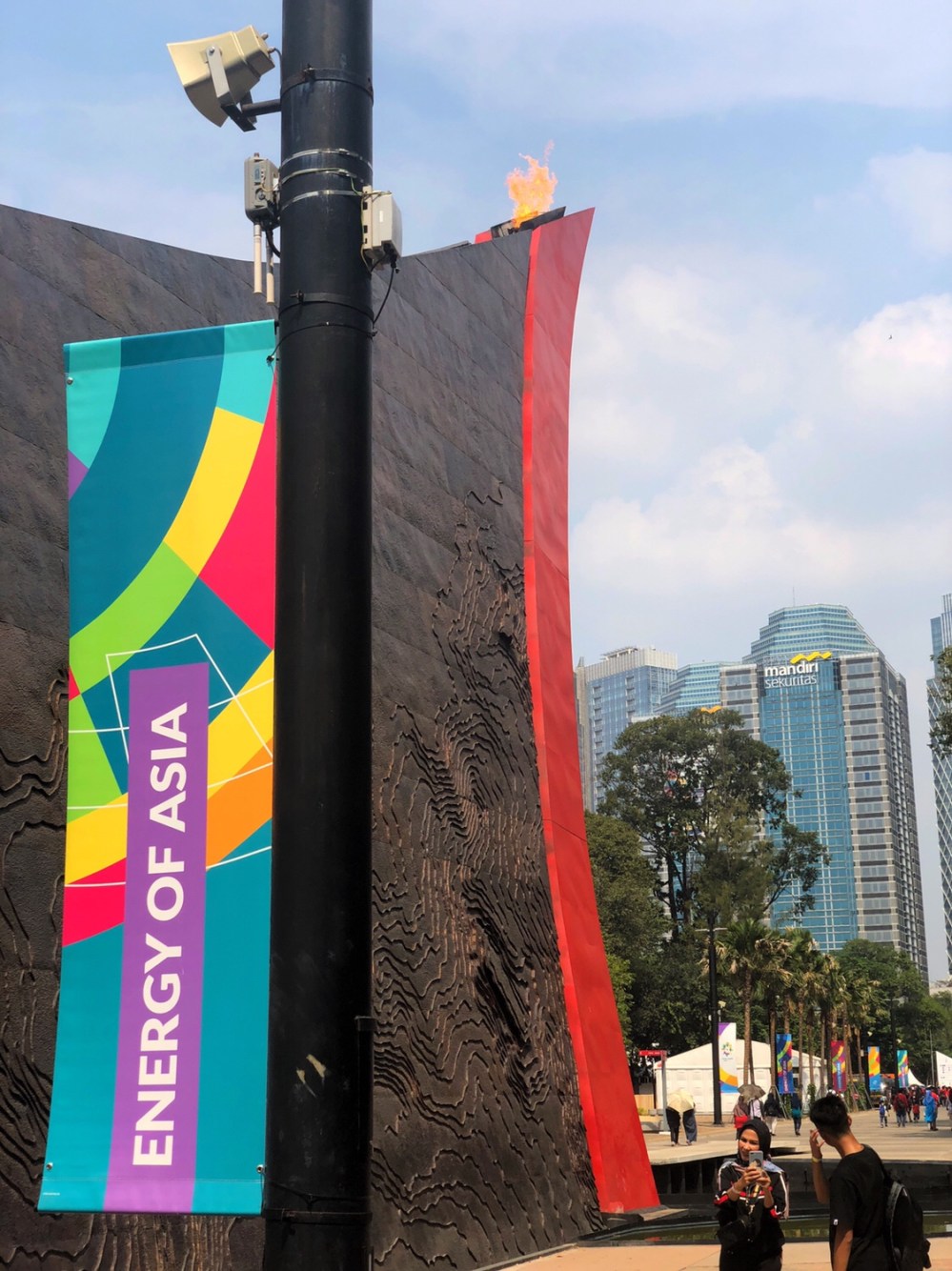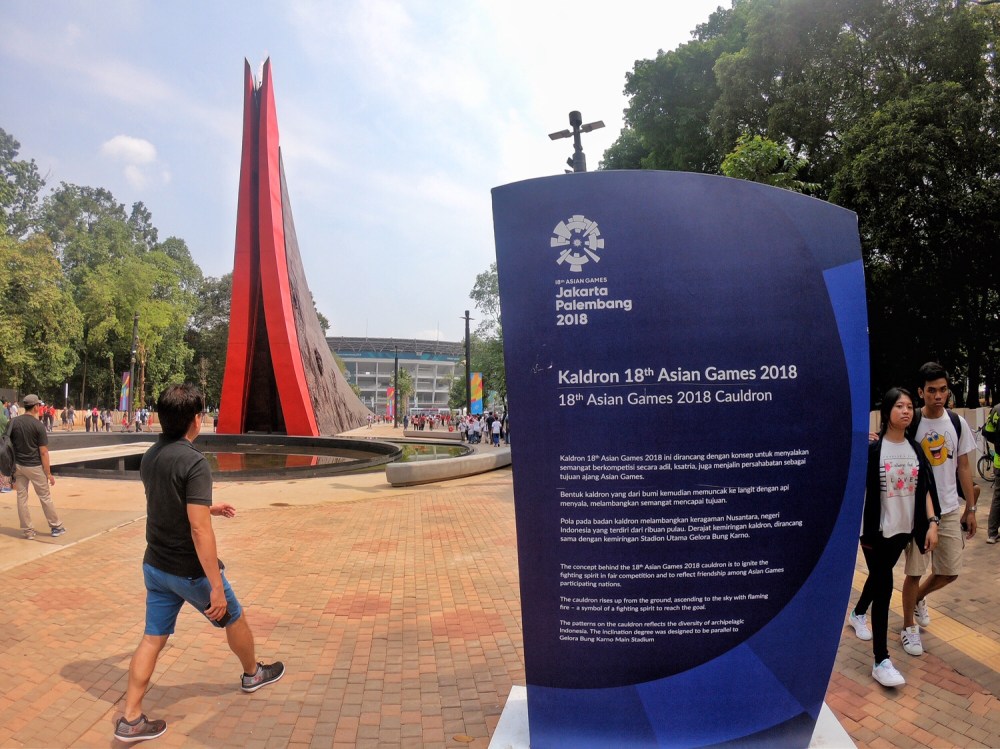 Jam 10 pagi, beringsut ke GBK untuk menyaksikan pertandingan atletik. Dan tentu saja berfoto bersama di kawasan GBK yang sudah dipercantik untuk Asian Games. Salah satu spot foto utama adalah kaldron Asian Games 2018 ini yang dinamakan “Bilah Nusantara”