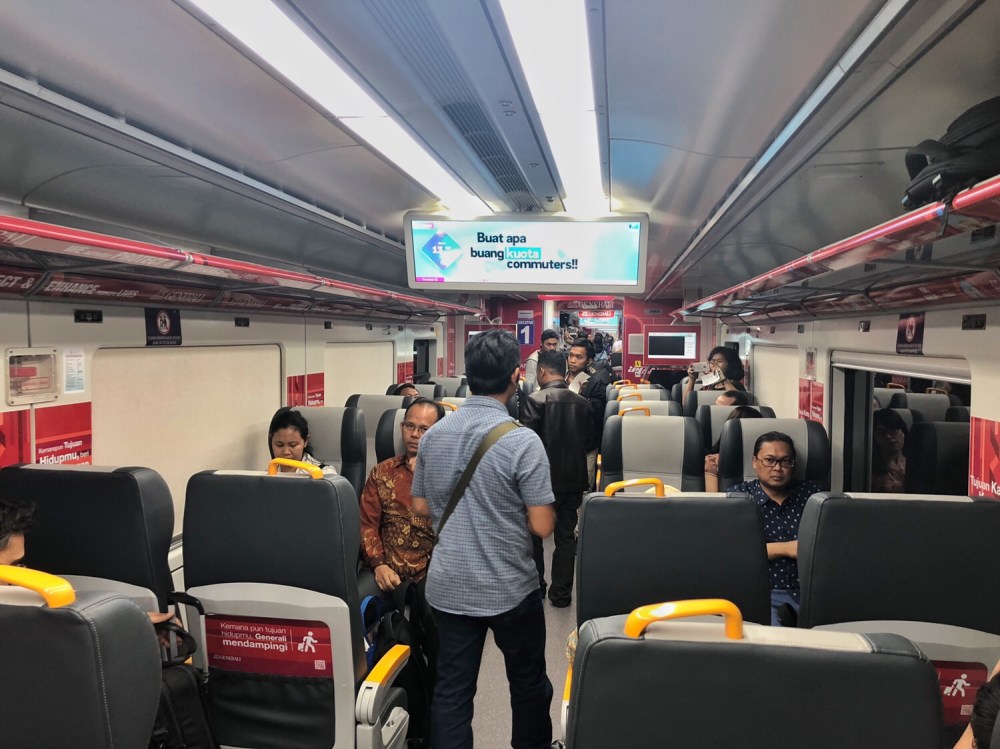 Gerbong cukup nyaman dan bersih. Disertai dengan panel penunjuk digital yang menampilkan berbagai konten modern. Di dalam gerbong tersedia tempat untuk meletakkan bagasi di bagian belakang gerbong dekat pintu keluar. Namun saya tidak melihat rak tempat menyusun koper-koper seperti di kereta bandara di Eropa atau Airport Express di HK. Jadi mungkin akan sedikit menyulitkan bagi yang membawa koper-koper besar.