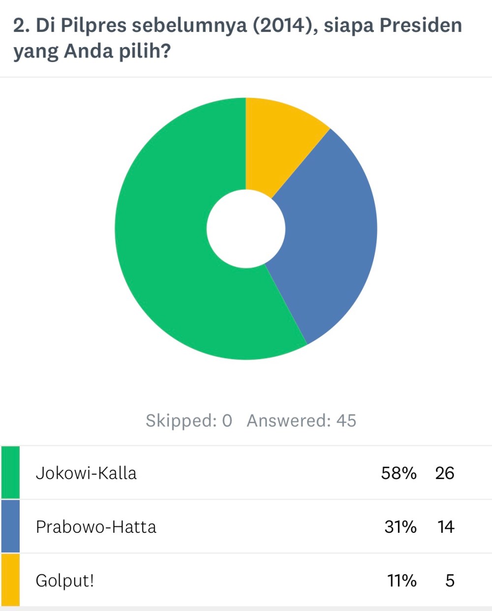 Dari 45 responden, 20 orang memilih pasangan Jokowi-Amin (44.44%), dan 19 orang memilih Prabowo-Sandi (42.22%). Masih ada 4 responden yang belum menentukan pilihan, dan 2 orang Golput. 4 orang responden bisa saja membalikkan hasil. Kesimpulannya: lampu merah untuk Jokowi!