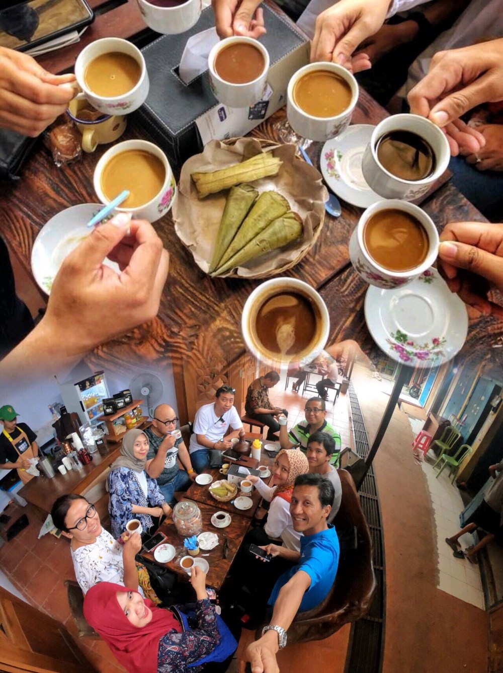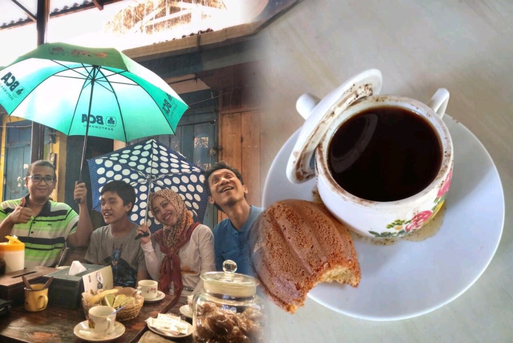 Di depan kedai diletakkan kursi kayu dan meja untuk 6-8 orang. Sederhana, namun asyik buat nongkrong. Kita yang bersepuluh kemudian menambah kursi dan duduk merapat. Hangat, penuh gelak tawa. Hanya satu minusnya. Saat hujan turun, saya dan istri yang duduk di sisi luar kedai terkena tempias hujan. Jadinya kita ngopi sambil payungan. Seru!