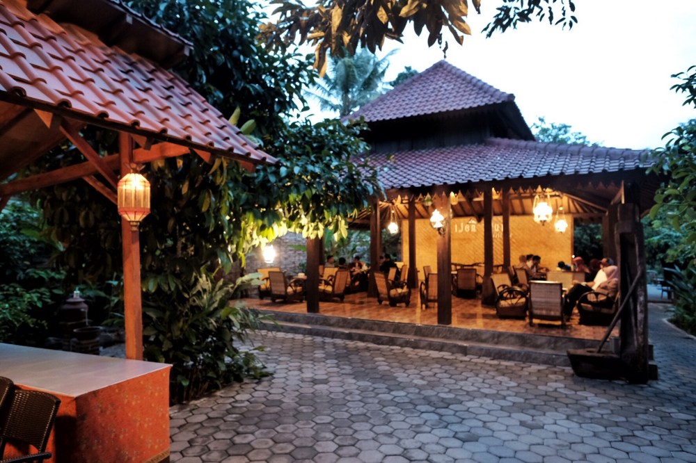 Tempat duduk dari rotan dan kayu yang berarsitektur Jawa kuno terletak di pendopo joglo. Saat kami datang, waktu sudah hampir mau maghrib. Lampu-lampu berwarna kekuningan dinyalakan, dan membuat suasana kafe ini semakin cozy.