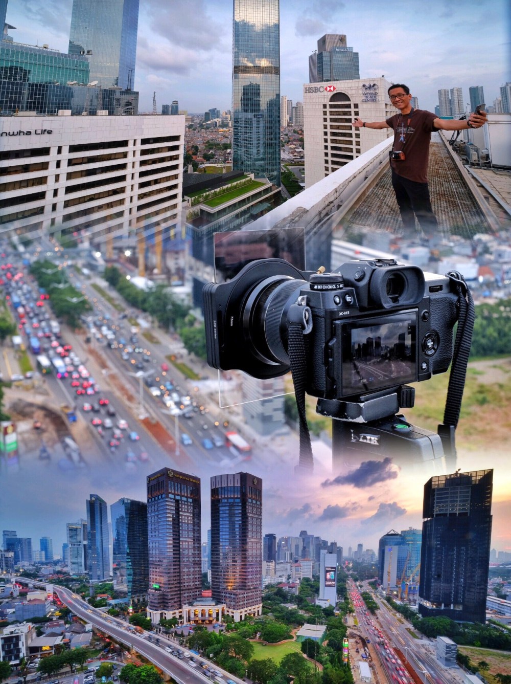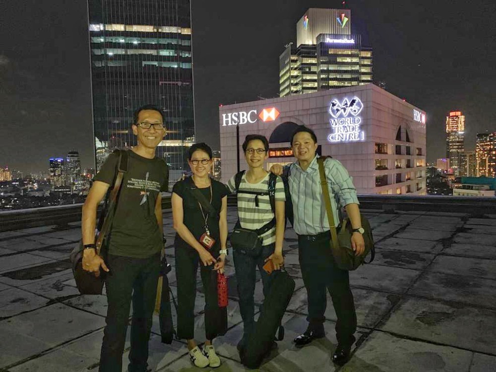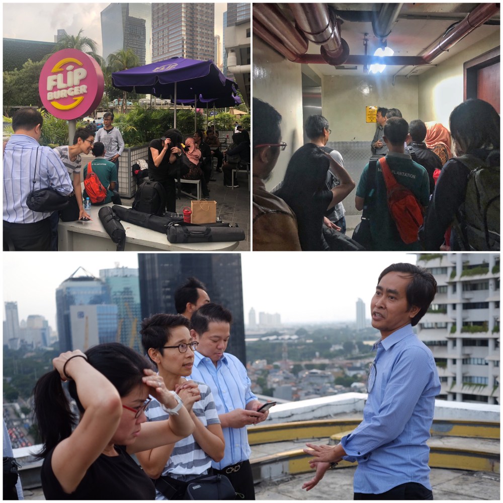 Sesampai di atas, kita di-briefing sebentar oleh Mas Miwa, pemandu kami. Karena gedung ini tidak memiliki pagar, kami diminta untuk berhati-hati dan menyiapkan perangkat tidak di pinggir gedung. Mulailah kita beraksi dan menyiapkan perangkat masing-masing. Filter disematkan. Tripod dipasang. Posisi menentukan prestasi ☺️