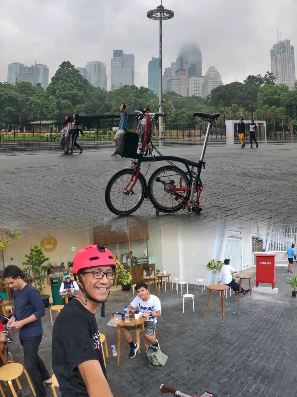 Namun sialnya, hujan yang tanpa kompromi pagi ini memaksa kita untuk berhenti dan berteduh di Gelora Bung Karno. Struktur stadion yang megah memberikan perlindungan dari hujan, sekaligus membolehkan kita untuk berolahraga berkeliling stadion. Ditambah dengan seduhan kopi nikmat di sudut stadion, we’re happy! 🚲 ☺️👍