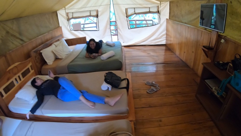 Masuk ke dalam tenda, kita menemukan kenyamanan khas hotel berbintang. Untuk tenda kami yang berkelas deluxe, terdapat satu buah queen-size bed, dan dua buah single bed yang ditaruh di lantai. Masing-masing kasur sudah dilengkapi dengan selimut hangat. Tidak ada AC memang. Tapi buat apa? Hawanya adem!