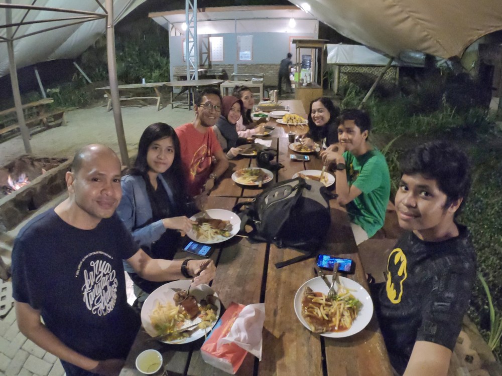Selain fasilitas dan aktifitas, yang perlu saya garis bawahi adalah servis dan pelayanan dari camp ini. Saya terus terang sangat puas. Petugas camp selalu siap dan responsif dalam memenuhi permintaan kita. Cita rasa masakan pun cukup nikmat. Kami mencoba barbecue menu seharga Rp 105 ribu per orang, yang Alhamdulillah nikmat dan menyenangkan.