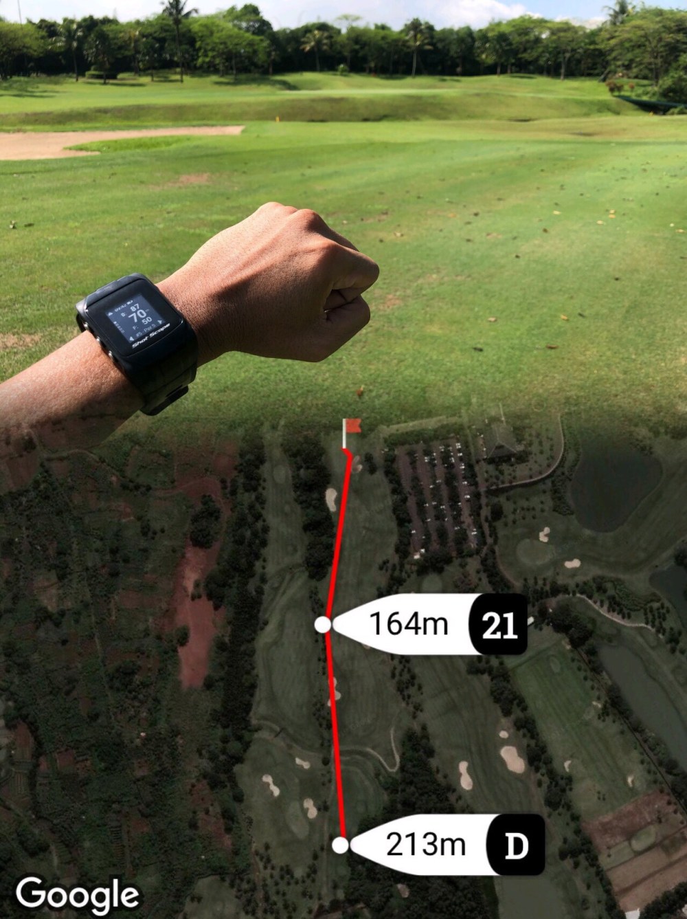 Nah, saat kita memasukkan jumlah putts dengan menekan tombol di jam, perangkat akan otomatis merekam koordinat GPS posisi tersebut sebagai posisi lubang.