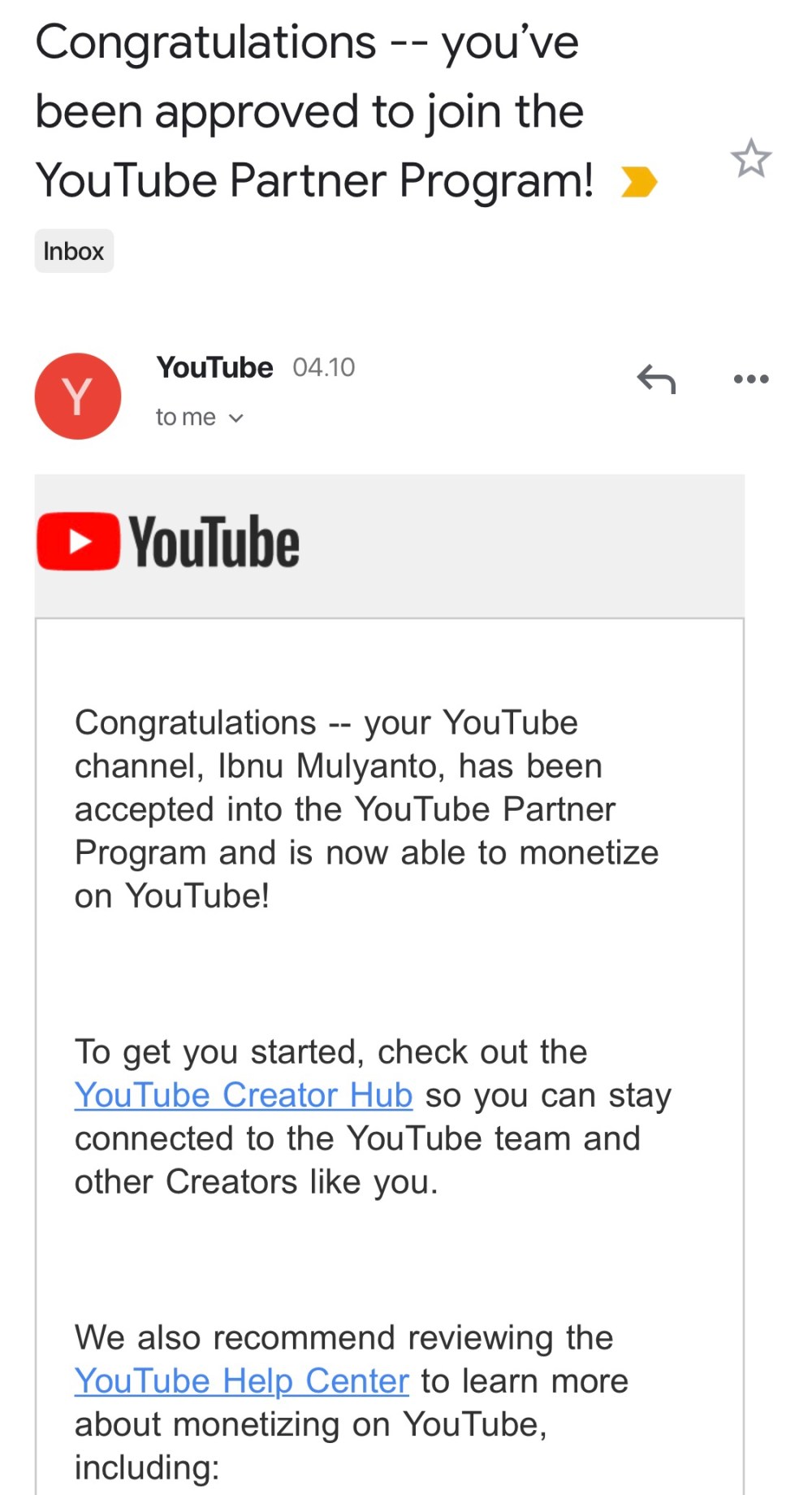 “Congratulations, your YouTube channel has been accepted into the YouTube Partner Program and is now able to monetize on YouTube!”