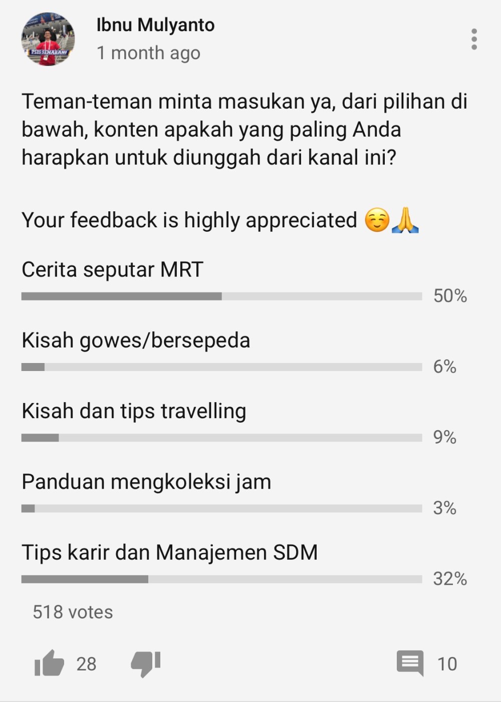 Pasalnya beberapa saat lalu saya menggelar survey ke subscriber saya. Dari 500 subscriber yang merespon, 50% dari mereka masih menginginkan konten mengenai MRT diunggah di kanal saya. Gimana dong?