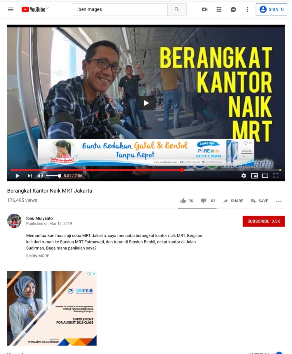 Jujur, kanal ini lumayan ngetop hanya gara-gara video saya mengenai MRT beberapa bulan lalu. Padahal saya sudah punya akun YouTube 10 tahunan. Tapi ya selama ini hanya untuk upload personal family videos kalau sedang traveling.